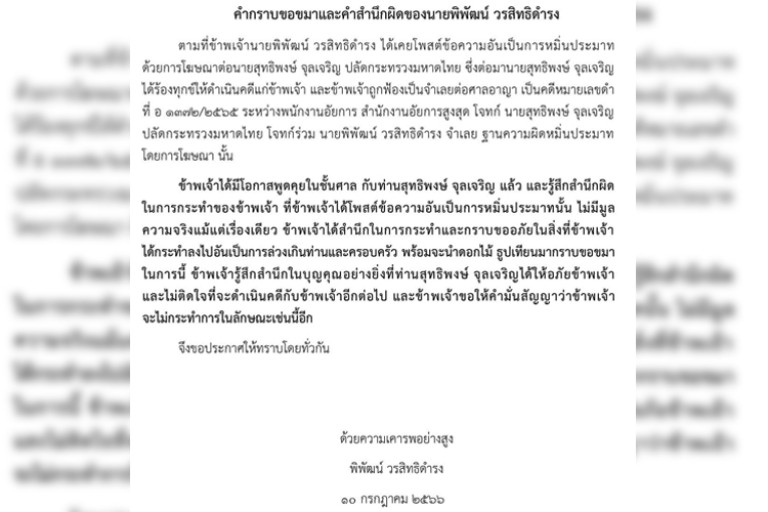 ตามที่ข้าพเจ้านายพิพัฒน์ วรสิทธิดำรง ได้เคยโพสต์ข้อความอันเป็นการหมิ่นประมาท ด้วยการโฆษณาต่อนายสุทธิพงษ์ จุลเจริญ ปลัดกระทรวงมหาดไทย ซึ่งต่อมานายสุทธิพงษ์ จุลเจริญ ได้ร้องทุกข์ให้ดำเนินคดีแก่ข้าพเจ้า และข้าพเจ้าถูกฟ้องเป็นจำเลยต่อศาลอาญา เป็นคดีหมายเลขดำ ที่ อ 1372/2565 ระหว่างพนักงานอัยการสำนักงานอัยการสูงสุด โจทก์ นายสุทธิพงษ์ จุลเจริญ ปลัดกระทรวงมหาดไทย โจทก์ร่วม นายพิพัฒน์ วรสิทธิดำรง จำเลย ฐานความผิดหมิ่นประมาทโดยการโฆษณา นั้น
