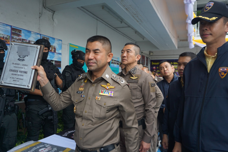 วันที่ 21 ก.ค.66 ที่ สภ.เมืองพัทยา จ.ชลบุรี พล.ต.อ.สุรเชษฐ์ หักพาล รอง ผบ.ตร. พร้อมด้วยเจ้าหน้าที่ตำรวจสืบสวนภูธรภาค 2, กองกำกับการสืบสวนกองบังคับการตรวจคนเข้าเมือง , ตำรวจท่องเที่ยวชลบุรี, สภ.เมืองพัทยา, สภ.หนองปรือ, สภ.นาจอมเทียน และ นปส.พัทยา ร่วมแถลงข่าวการจับกุม Mr.Thomas สัญชาติออสเตรเลีย หัวหน้ากลุ่มรถจักรยานยนต์บิ๊กไบค์ชื่อดังพื้นที่เมืองพัทยา ได้ที่บ้านเลขที่ 55/57 ต.หนองปรือ อ.บางละมุง จ.ชลบุรี พร้อมตรวจยึดสิ่งของภายในบ้าน อาทิ รถจักรยานยนต์ยี่ห้อ HARLEY DAVIDSON และอุปกรณ์อื่นๆ ซึ่งมีความเกี่ยวโยงกับแก๊งค์รถจักรยานยนต์กลุ่มบิ๊กไบค์ที่มีชื่อเสียงระดับโลก