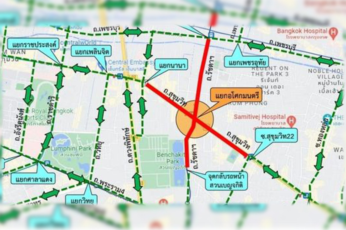 ทั้งนี้ แนะนำให้ประชาชนใช้เส้นทางถนนพระรามที่ 4 โดยใช้ทางลัดซอยสุขุมวิท 16 ซอยสุขุมวิท 22 ซอยสุขุมวิท 26 และสุขุมวิท 36 เชื่อมไปยังถนนสุขุมวิท หรือใช้ถนนเพชรบุรีตัดใหม่ เลี้ยวซ้ายแยกทองหล่อเหนือ แยกพร้อมพงษ์ แยกอโศกเพชร และแยกนานา เพื่อเชื่อมไปยังถนนสุขุมวิททดแทนเพื่อหลีกเลี่ยงผลกระทบจากการจราจร