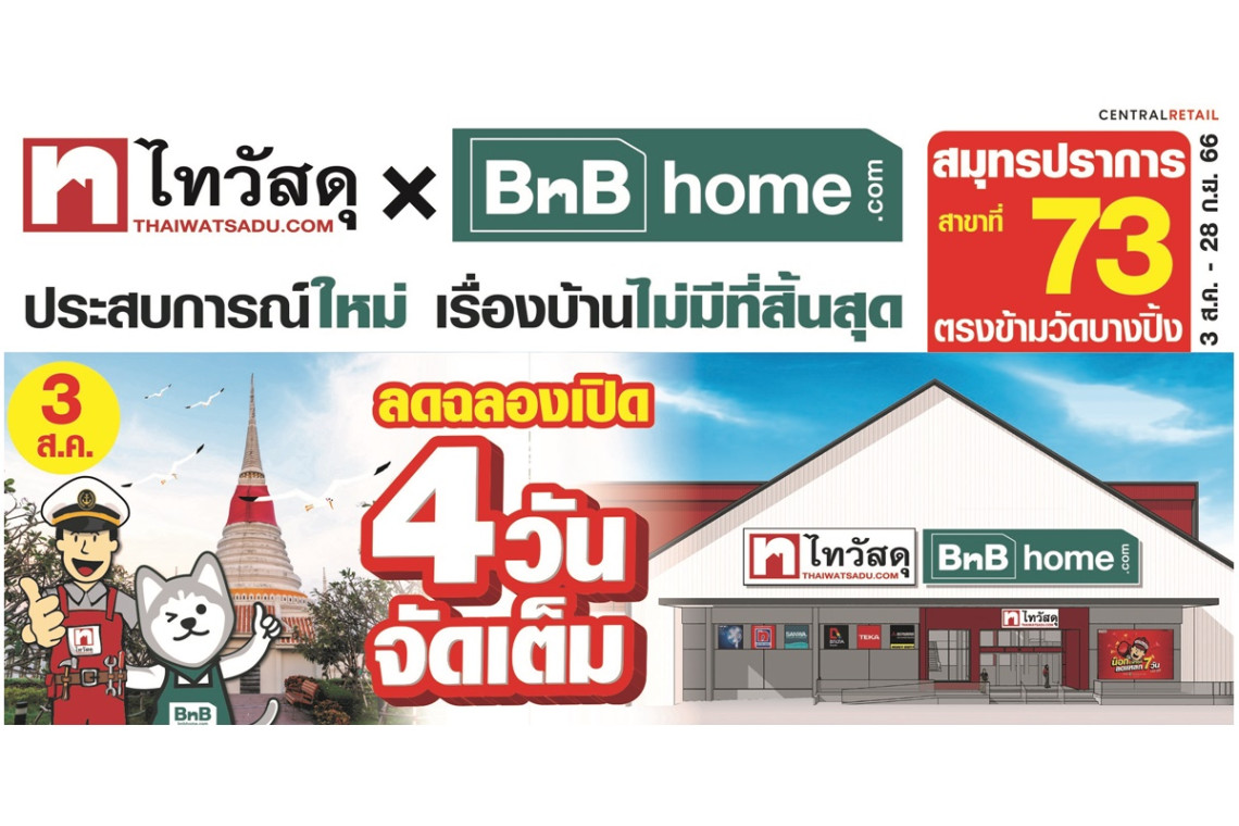 ไทวัสดุ ผู้นำธุรกิจค้าปลีกวัสดุก่อสร้างและสินค้าตกแต่งบ้าน ภายใต้ บริษัท ซีอาร์ซี ไทวัสดุ จำกัด ในเครือเซ็นทรัล รีเทล เร่งขับเคลื่อนเศรษฐกิจในไตรมาส 3 ผ่านการขยายสาขา “ไทวัสดุ x บีเอ็นบี โฮม สาขาสมุทรปราการ” ซึ่งเป็นสาขาที่ 73 ของประเทศ บนทำเลแห่งใหม่ สุขุมวิท-ศรีนครินทร์ จุดเชื่อมต่อใจกลางย่านธุรกิจ ไลฟ์สไตล์ และการอยู่อาศัย ครบครันด้วยสินค้าวัสดุก่อสร้างและของแต่งบ้านแบรนด์ดังกว่า 38,000 รายการ พร้อมส่งส่วนลดทุกกลุ่มสินค้าแบบจัดเต็ม อาทิ ชุดเครื่องครัว ชุดเครื่องนอน สุขภัณฑ์ โคมไฟ ประตู เฟอร์นิเจอร์ เครื่องใช้ไฟฟ้า กระเบื้อง เครื่องมือช่าง อุปกรณ์ช่าง ฯลฯ โดยสามารถร่วมฉลองการเปิดสาขาใหม่พร้อมกันได้ตั้งแต่วันที่ 3–6 สิงหาคม 2566 ผ่านโปรโมชันที่น่าสนใจ ดังนี้