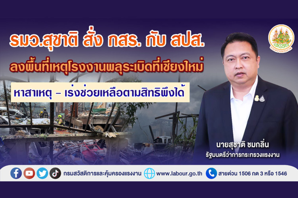 รัฐมนตรีว่าการกระทรวงแรงงาน สั่งกรมสวัสดิการและคุ้มครองแรงงาน ลงพื้นที่พร้อมกับสำนักงานประกันสังคม ช่วยเหลือลูกจ้างโรงงานพลุระเบิด จ.เชียงใหม่