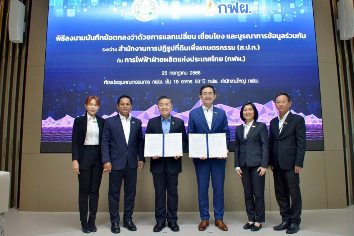 ส.ป.ก.-กฟผ. ลงนามบันทึกข้อตกลงความร่วมมือการแลกเปลี่ยน เชื่อมโยง และบูรณาการข้อมูล โดยเชื่อมโยงการพัฒนาระบบจัดที่ดินออนไลน์ของ ส.ป.ก. และระบบจัดการข้อมูลงานจัดกรรมสิทธิ์ที่ดินของ กฟผ. ด้วยเทคโนโลยีดิจิทัล เสริมประสิทธิภาพภารกิจด้านที่ดินของทั้งสองหน่วยงานให้รวดเร็วยิ่งขึ้น ทั้งการขออนุญาตใช้ที่ดินตามระเบียบ การจ่ายเงินค่าทดแทนแก่เกษตรกรในเขตปฏิรูปที่ดิน และเงินค่าตอบแทนการใช้ประโยชน์ที่ดินแก่ ส.ป.ก. ที่โครงข่ายไฟฟ้าพาดผ่าน