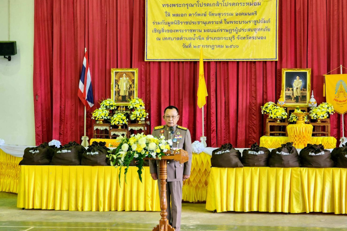 วันนี้ 25 กรกฎาคม 2566 เวลา 10.45 น. พระบาทสมเด็จพระเจ้าอยู่หัว ทรงพระกรุณาโปรดเกล้าโปรดกระหม่อมให้ พลเอกดาว์พงษ์ รัตนสุวรรณ องคมนตรี ร่วมกับมูลนิธิราชประชานุเคราะห์ ในพระบรมราชูปถัมภ์ เชิญถุงพระราชทานและเครื่องอุปโภคบริโภค จำนวน 1,929 ถุง ไปมอบแก่ผู้ว่าราชการจังหวัด และนายอำเภอ ซึ่งตัวแทนราษฎรที่ประสบอุทกภัย และมอบแก่ราษฎรที่ประสบอุทกภัยในพื้นที่จังหวัดระนอง ณ หอประชุมเทศบาลตำบลน้ำจืด อำเภอกระบุรี จังหวัดระนอง