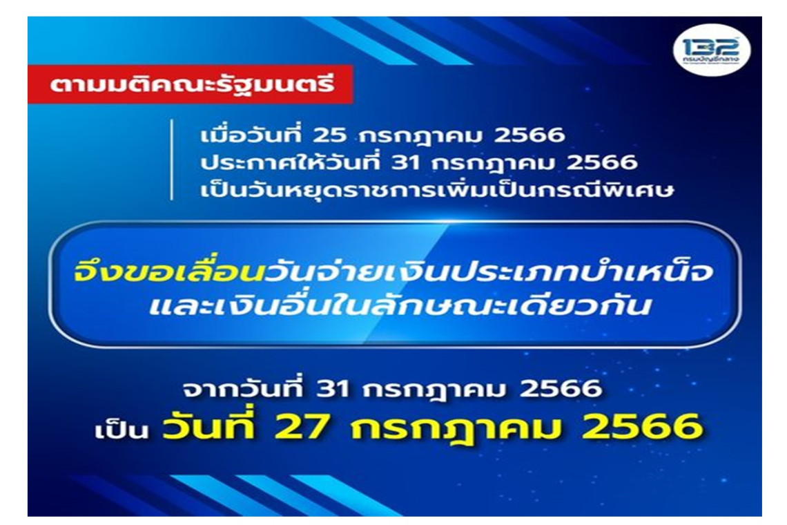 แฟนเพจ กรมบัญชีกลาง The Comptroller General's Department แจ้งว่า ขอเลื่อนวันจ่ายเงินประเภทบำเหน็จและเงินอื่นในลักษณะเดียวกัน จากวันที่ 31 ก.ค.66 เป็นวันที่ 27 ก.ค.66 จากกรณีที่ประชุมคณะรัฐมนตรี (ครม.) สำนักเลขาธิการคณะรัฐมนตรี (สลค.) เสนอพิจารณากำหนดวันหยุดราชการเพิ่มเป็นกรณีพิเศษประจำปี 2566 (เพิ่มเติม) คือวันที่ 31 ก.ค.66 เป็นวันหยุดราชการเพิ่มเป็นกรณีพิเศษ