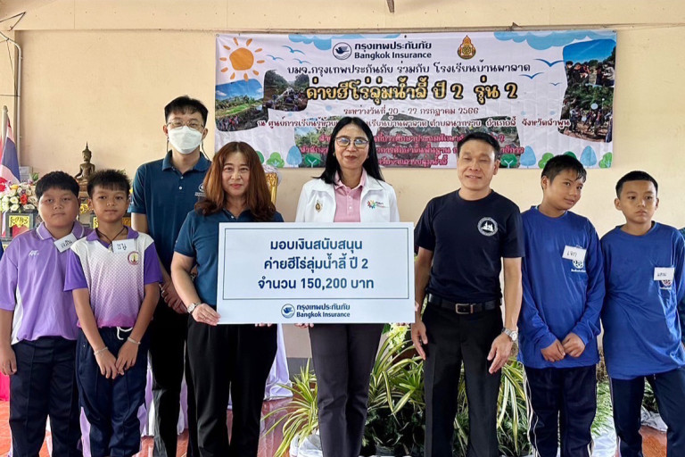 บริษัท กรุงเทพประกันภัย จำกัด (มหาชน) ร่วมปลูกจิตสำนึกให้แก่เยาวชนในการดูแลผืนป่าต้นน้ำ รักษาดิน และลุ่มน้ำ เพื่อการอนุรักษ์ทรัพยากรธรรมชาติอย่างยั่งยืน โดยนางสาวปรางทอง รัตนพิบูลวงศ์ (ที่ 3 จากซ้าย) ผู้จัดการสาขาลำปาง เป็นผู้แทนบริษัทฯ มอบเงินสนับสนุนจำนวน 150,200 บาท ให้แก่โรงเรียนบ้านผาลาด จังหวัดลำพูน สำหรับการจัดกิจกรรมค่ายฮีโร่ลุ่มน้ำลี้ ปี 2 เพื่อส่งเสริมการเรียนรู้และพัฒนาศักยภาพของนักเรียนตามแนวพระราชทานอารยเกษตร สืบสาน รักษา ต่อยอด ตามพระราชดำริเศรษฐกิจพอเพียงด้วย “โคก หนองนา แห่งน้ำใจ และความหวัง” ให้สามารถพึ่งพาตนเอง ช่วยเหลือผู้อื่น และบริหารจัดการทรัพยากรธรรมชาติในท้องถิ่นให้เกิดความยั่งยืน โดยมี ดร.กุลชนกนันท์ ธนโชติกิจเกื้อกูล (ยืนกลาง)รองผู้อำนวยการสำนักงานเขตพื้นที่การศึกษา ประถมศึกษาลำพูน เขต 2 เป็นผู้รับมอบ ณ ศูนย์การเรียนรู้ห้วยแม่ฮู โรงเรียนบ้านผาลาด ตำบลนาทราย อำเภอลี้ จังหวัดลำพูน เมื่อเร็วๆ นี้