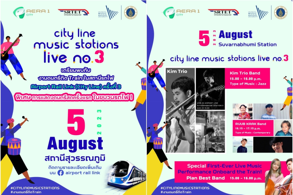 บริษัท เอเชีย เอรา วัน จำกัด ผู้ร่วมลงทุนโครงการรถไฟความเร็วสูงเชื่อมสามสนามบิน และปัจจุบันเป็นผู้ให้การสนับสนุนการเดินรถไฟฟ้าแอร์พอร์ต เรล ลิงก์ ภายใต้การกำกับดูแลของ บริษัท รถไฟฟ้า ร.ฟ.ท จำกัด ร่วมกับ วิทยาลัยดุริยางคศิลป์ มหาวิทยาลัยมหิดล จัดงานดนตรี “City Line Music Station Live No. 3” ในสถานีรถไฟฟ้า แอร์พอร์ต เรล ลิงก์ สุวรรณภูมิ เพื่อสร้างสีสันและเติมความสุขในการเดินทางให้กับผู้โดยสารรถไฟฟ้าแอร์พอร์ต เรล ลิงก์ นักท่องเที่ยว และประชาชนทั่วไป ได้เพลิดเพลินไปกับวงดนตรี 2 แบบ 2 สไตล์ ในวันที่ 5 สิงหาคม 2565 โดยมีรายละเอียดการแสดงดนตรีดังนี้