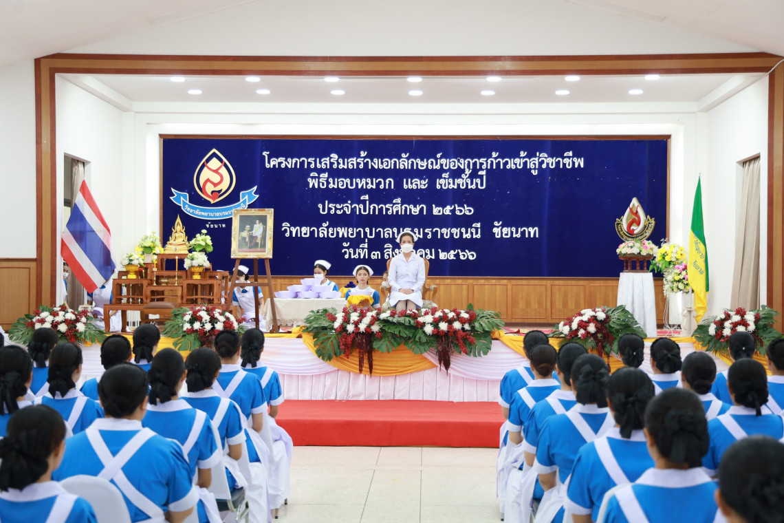 เวลา 09.00 น.วันที่ 3 สิงหาคม 2566 ที่หอประชุมทรงบาดาล วิทยาลัยพยาบาลบรมราชชนนี ชัยนาท ตำบลชัยนาท อำเภอเมือง จังหวัดชัยนาท ดร.ชุติมา มาลัย ผู้อำนวยการวิทยาลัยพยาบาลบรมราชชนนี ชัยนาท คณะพยาบาลศาสตร์ สถาบันพระบรมราชชนก เป็นประธานโครงการเสริมสร้างเอกลักษณ์ของการก้าวเข้าสู่วิชาชีพ พิธีรับหมวกและเข็มชั้นปี ปีการศึกษา 2566 ให้กับนักศึกษาพยาบาลศาสตรบัณฑิต ชั้นปีที่ 2 รุ่นที่ 30 จำนวน 108 คน นางสาวจารุวรรณ ก้านศรี รองผู้อำนวยการวิทยาลัยพยาบาลบรมราชชนนี ชัยนาท รายงานว่า พิธีการรับหมวก เป็นพิธีที่แสดงถึงการก้าวเข้าสู่วิชาชีพการพยาบาลของนักศึกษาพยาบาล เป็นการปลูกฝังค่านิยมแห่งวิชาชีพและจรรยาบรรณวิชาชีพการพยาบาลและแสดงให้เห็นว่านักศึกษาพยาบาล ได้ผ่านการเรียนรู้มาด้วยความมุ่งมั่นตั้งใจ มีมานะอดทน จนมีความรู้ความสามารถและพร้อมก้าวเข้าสู่วิชาชีพพยาบาล หมวกและเข็มเป็นสัญลักษณ์ที่บอกถึงความรู้ความสามารถของวิชาชีพพยาบาลที่เพิ่มมากขึ้นของนักศึกษาพยาบาล