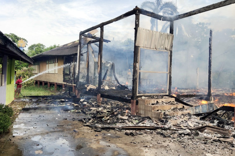 ที่เกิดเหตุเป็นอาคารเรียนไม้ชั้นเดียวแบบยกพื้นพบเพลิงกำลังโหมลุกไหม้อย่างรุนแรง เจ้าหน้าที่ได้เร่งระดมฉีดน้ำสกัดเพื่อควบคุมไม่ให้ลุกลามไปยังอาคารข้างเคียง แต่ระหว่างนั้นเกิดไฟฟ้าลัดวงจร ทำให้เกิดไฟลุกไหม้ที่อาคารปูนใกล้กันอีกหลังหนึ่ง ซึ่งเป็นห้องทำงานของ ผอ.และ ห้องเซฟเวอร์กล้องวงจรปิด โดยชุดดับเพลิงใช้เวลากว่า 2 ชม. จึงสามารถควบคุมเพลิงเอาไว้ได้