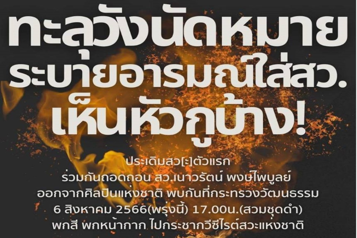 5 สิงหาคม 2566 17:02 น. สยามรัฐออนไลน์ การเมือง เมื่อวันที่ 5 ส.ค.66 เพจ ทะลุวัง – ThaluWang โพสต์ข้อความระบุว่า “พกสี พกหน้ากาก ไปกระชากกวีซีไรต์สวะแห่งชาติ! แต่งชุดดำร่วมสร้างสรรค์ศิลปะ ณ กระทรวงวัฒนธรรม 6 สิงหาคม 2566 เวลา 17:00น.” #เห็นหัวกูบ้าง #ถอดถอนศิลปินแห่งชาติ