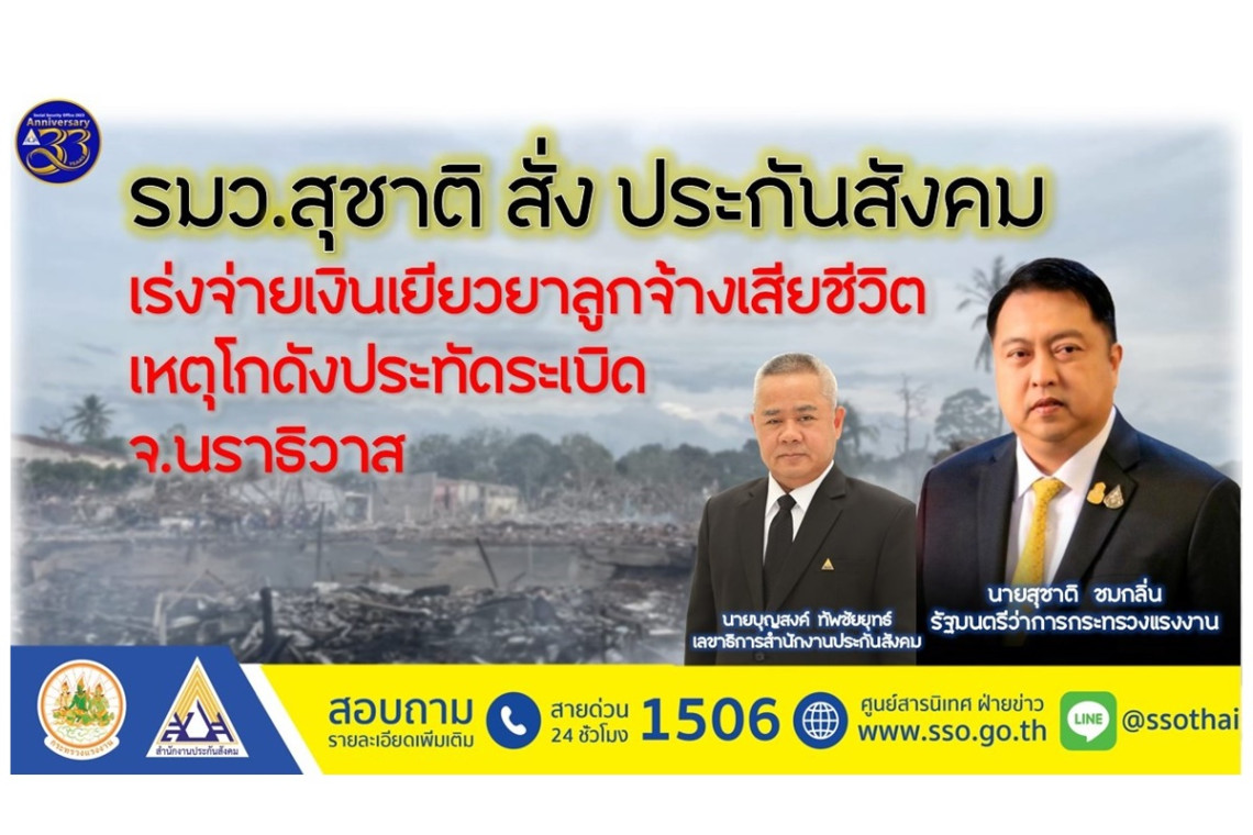 "รมว.สุชาติ" สั่งประกันสังคม เร่งจ่ายเงินเยียวยา ลูกจ้างเสียชีวิตเหตุโกดังประทัดระเบิดใน อ.สุไหงโก-ลก จ.นราธิวาส