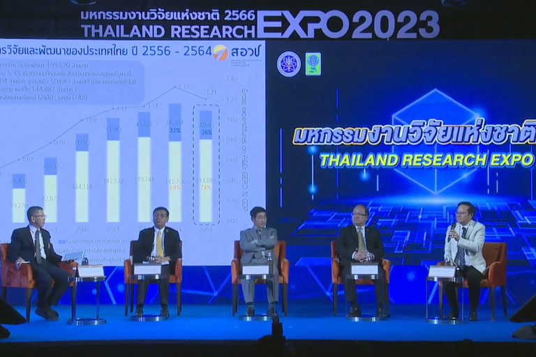 ในงานมหกรรมวิจัยแห่งชาติ 2566 (Thailand Research Expo 2023) มีการจัดเสวนาในหัวข้อ “ทิศทางการลงทุนด้านการวิจัยและนวัตกรรมเพื่อประโยชน์ด้านเศรษฐกิจและสังคมในการพัฒนาประเทศ” โดยมี กศว.-สภาพัฒน์ -สอวช.-สภาอุตฯ จี้รัฐออกมาตรการสร้างแรงจูงใจภาคเอกชน เพิ่มลงทุนวิจัยและนวัตกรรม นำพาประเทศไทยพ้นกับดักรายได้ปานกลาง สู่ประเทศพัฒนาแล้ว