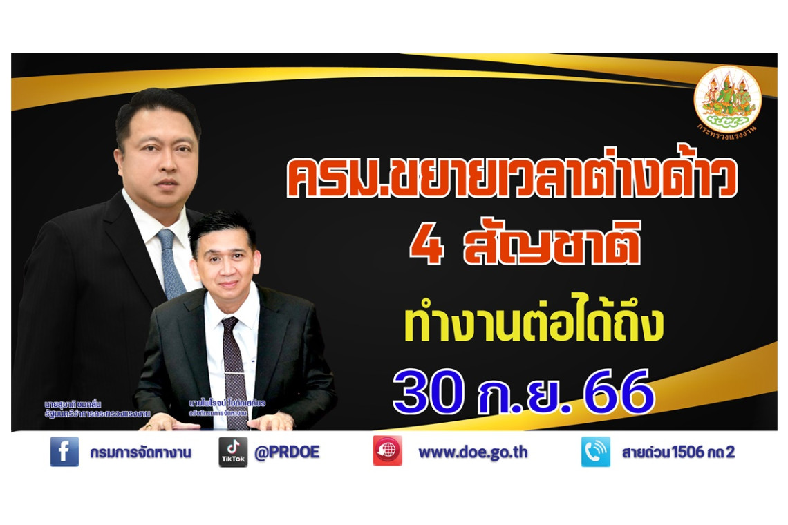 ทั้งนี้ นายจ้าง สถานประกอบการ และแรงงานต่างด้าวที่มีข้อสงสัย ต้องการสอบถามรายละเอียดเพิ่มเติมติดต่อได้ที่สำนักงานจัดหางานจังหวัดทุกจังหวัด สำนักงานจัดหางานกรุงเทพมหานครพื้นที่ 1 – 10 หรือที่สายด่วนกระทรวงแรงงาน โทร.1506 กด 2 กรมการจัดหางาน หรือสายด่วนกรมการจัดหางาน โทร. 1694
