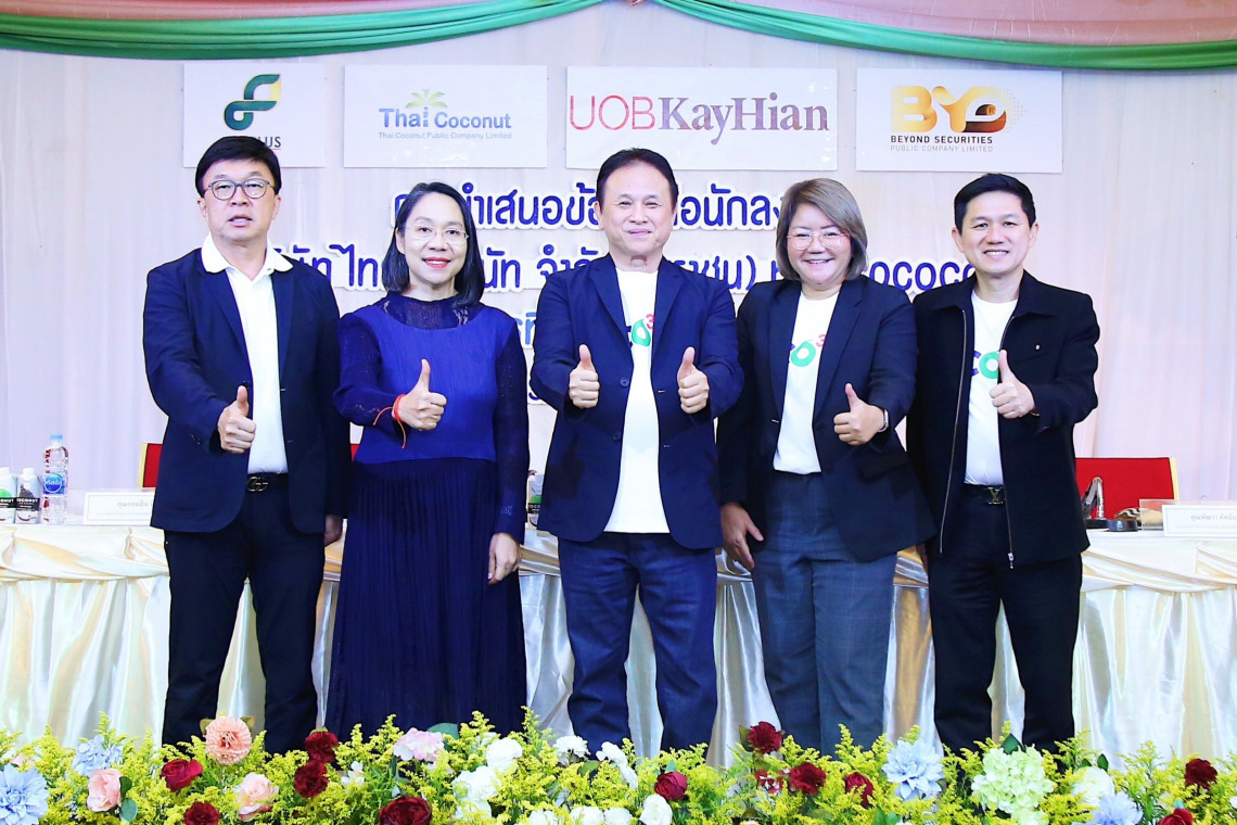 วรวัฒน์ ชิ้นปิ่นเกลียว ประธานเจ้าหน้าที่บริหาร พัฒนา ทัศจันทร์ ประธานเจ้าหน้าที่ฝ่ายการเงินและสารสนเทศ บริษัท ไทย โคโคนัท จำกัด (มหาชน) หรือ COCOCO เสกสรรค์ ธโนปจัย ประธานเจ้าหน้าที่บริหาร บริษัท ฟิน พลัส แอดไวเซอรี่ จำกัด ในฐานะที่ปรึกษาทางการเงิน ชัยพัชร์ นาคมณฑนาคุ้ม ประธานเจ้าหน้าที่บริหาร บริษัทหลักทรัพย์ ยูโอบี เคย์เฮียน (ประเทศไทย) จำกัด (มหาชน) ในฐานะผู้จัดการการจัดจำหน่ายและรับประกันการจำหน่ายร่วม หรือ Joint Lead Underwriters ออมสิน ศิริ ประธานเจ้าหน้าที่บริหาร บริษัทหลักทรัพย์ บียอนด์ จำกัด (มหาชน) ในฐานะผู้จัดการการจัดจำหน่ายและรับประกันการจำหน่ายร่วม หรือ Joint Lead Underwriters ร่วมนำเสนอข้อมูลบริษัทฯ ให้กับนักลงทุน เพื่อตอกย้ำความเชื่อมั่นการเป็นผู้นำตลาดผลิตภัณฑ์จากมะพร้าว ที่มีผลการดำเนินงานเติบโตต่อเนื่องมาตลอดระยะเวลา 15 ปี โดย COCOCO จะเสนอขายหุ้นไอพีโอ จำนวนไม่เกิน 370 ล้านหุ้น เข้าจดทะเบียนในตลาดหลักทรัพย์แห่งประเทศไทย ภายในไตรมาส 3/2566 นี้ ณ ห้องประชุมเมืองเชียงใหม่ โรงแรมดิ เอ็มเพลส จ.เชียงใหม่ โดยได้รับความสนใจจากนักลงทุนเข้ารับฟังข้อมูลอย่างล้นหลาม
