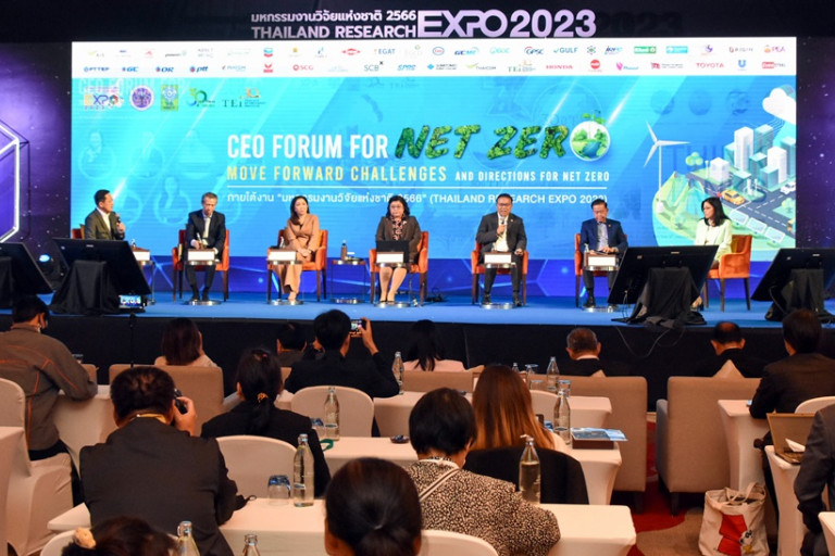 วันที่สี่ของมหกรรมงานวิจัยแห่งชาติ 2566 (Thailand Research Expo 2023) สำนักงานการวิจัยแห่งชาติ (วช.) กระทรวงการอุดมศึกษา วิทยาศาสตร์ วิจัยและนวัตกรรม เมื่อวันที่ 10 สิงหาคม 2566 จัดเสวนา“CEO Forum for Net Zero : Move forward Challenges and Directions for Net Zero” โดยมี ดร.วิภารัตน์ ดีอ่อง ผู้อำนวยการสำนักงานการวิจัยแห่งชาติ พร้อมด้วย ดร.วิจารย์ สิมาฉายา เลขาธิการองค์กรธุรกิจเพื่อการพัฒนาที่ยั่งยืน (TBCSD) และ ประธานกรรมการองค์การบริหารจัดการก๊าซเรือนกระจก คุณนฤพรรณ สุธรรมเกษม ผู้ช่วยกรรมการผู้จัดการใหญ่ สายงานกลยุทธ์องค์กรและความยั่งยืน บริษัท บางจาก คอร์ปอเรชั่น จำกัด (มหาชน) คุณนินนาท ไชยธีรภิญโญ ประธานชมรมไฮโดรเจน ประเทศไทย คุณฉัตรชัย เลื่อนผลเจริญชัย ประธานบริหาร กลุ่มบริษัท ดาว ประเทศไทย (DOW) และ คุณขัตติยา อินทรวิชัย ประธานเจ้าหน้าที่บริหาร ธนาคารกสิกรไทย จำกัด (มหาชน) ดำเนินรายการโดย คุณบัญชา ชุมชัยเวทย์ พิธีกรรายการและผู้ประกาศข่าวทางช่อง 3 ณ ห้องเวิลด์บอลรูม ชั้น 23 โรงแรมเซ็นทาราแกรนด์และบางกอกคอนเวนชัน เซ็นเตอร์ เซ็นทรัลเวิลด์ กรุงเทพมหานคร