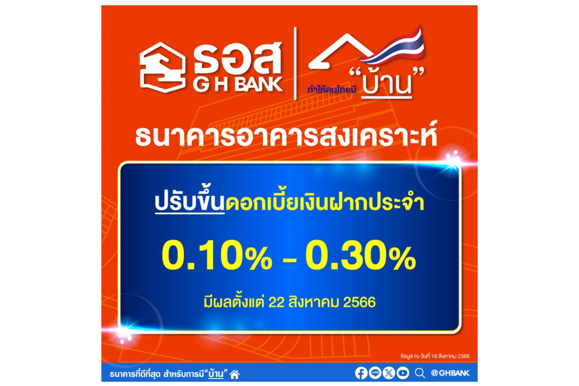 ธอส.ประกาศปรับขึ้นอัตราดอกเบี้ยเงินฝากประจำ สูงสุด 0.30% ต่อปี มีผลตั้งแต่ 22 ส.ค.566 เป็นต้นไป