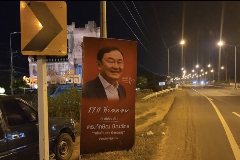 ผู้สื่อข่าวรายงานว่า เมื่อวันที่ 20 สิงหาคม 2566 ที่บริเวณเชิงสะพานห้วยแฮด ตำบลโพธิ์อำเภอเมือง จังหวัดศรีสะเกษ ได้มีรถปิ๊กอัพ ยี่ห้อโตโยต้าสีดำ รุ่นวีโก้หมายเลขทะเบียน  อุบลราชธานี ที่บริเวณท้ายกระบะ มีป้ายอยู่หลายแผ่น โดยผู้ที่ขับรถมา ได้นำเอาป้ายมา ติดตั้งที่เสาไฟฟ้าส่องสว่างก่อนถึงทางข้ามสะพานห้วยแฮด โดยภาพในป้ายเป็นภาพของ ดร.ทักษิณ ชินวัตร อดีตนายกรัฐมนตรีของไทย ตามภาพ ดร.ทักษิณ สวมเสื้อสูทสีเข้ม ด้านในเป็นเสื้อสีขาว มีข้อความ ว่า นายกในดวงใจ  17 ปีที่รอคอย ยินดีต้อนรับ ดร.ทักษิณ ชินวัตร “กลับบ้านเรา รักรออยู่” จังหวัดศรีสะเกษ ซึ่งปรากฏว่า  แผ่นป้ายดังกล่าว ได้รับความสนใจจากประชาชนชาวศรีสะเกษที่สัญจรผ่านไปมาเป็นอย่างมาก ทั้งนี้เนื่องจากมีข่าวว่า ดร.ทักษิณ ชินวัตร จะเดินทางกลับเข้ามาประเทศไทยในวันที่ 22 สิงหาคม 2566 ที่จะถึงนี้ ทำให้กลุ่มเสื้อแดงศรีสะเกษ พากันขึ้นป้ายต้อนรับตามสถานที่ต่างๆ ในเขตพื้นที่ จ.ศรีสะเกษ