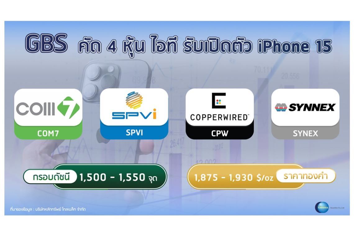 ทั้งนี้ ยังมีปัจจัยที่ต้องจับตาในประเทศ อาทิ วันที่ 23-25 ส.ค. ตลาดหลักทรัพย์แห่งประเทศไทย(ตลท.) จัดงานใหญ่ Thailand Focus 2023 "The New Horizon" นำเสนอข้อมูลกับผู้ลงทุนสถาบันทั่วโลก สัปดาห์ที่ 5 สำนักงานเศรษฐกิจการคลัง (สศค.) รายงานภาวะเศรษฐกิจ การคลัง ภาวะเศรษฐกิจภูมิภาค ดัชนีความเชื่อมั่นอนาคตเศรษฐกิจภูมิภาค สำนักงานเศรษฐกิจอุตสาหกรรม (สศอ.) แถลงดัชนีอุตสาหกรรม วันนี้ (22 ส.ค.) สหรัฐ รายงานยอดขายบ้านมือสองเดือนก.ค. วันที่ 23 ส.ค. อียู รายงานดัชนีผู้จัดการฝ่ายจัดซื้อ (PMI) ภาคการผลิต-ภาคบริการขั้นต้นเดือนส.ค. สหรัฐ รายงานดัชนีผู้จัดการฝ่ายจัดซื้อ (PMI) ภาคการผลิต-ภาคบริการขั้นต้นเดือนส.ค. ยอดขายบ้านใหม่เดือนก.ค. สต็อกน้ำมันรายสัปดาห์ วันที่ 24 ส.ค. สหรัฐ รายงานจ้านวนผู้ขอรับสวัสดิการว่างงานรายสัปดาห์ ยอดสั่งซื้อสินค้าคงทนเดือนก.ค. ดัชนีกิจกรรมเศรษฐกิจทั่วประเทศเดือนก.ค. วันที่ 24 - 26 ส.ค. การประชุมประจ้าปีของ FED ที่เมืองแจ็กสัน โฮล รัฐไวโอมิง ภายใต้หัวข้อ "Structural Shifts in the Global Economy" นายเจอโรม พาวเวล ประธานธนาคารกลางสหรัฐ (เฟด) มีกำหนดกล่าวสุนทรพจน์ในวันศุกร์ที่ 25 ส.ค.และ วันที่ 25 ส.ค. สหรัฐ รายงานดัชนีความเชื่อมั่นผู้บริโภคเดือนส.ค. ดังนั้น แนะนำกลยุทธ์การลงทุนใน 4 หุ้นเด่นจากการรายงานว่าไอโฟน 15 รุ่นใหม่ที่จะประกาศเปิดตัวในเดือน ก.ย.นี้ ในรุ่นโปรจะมีการอัพเกรดกล้องและหน่วยประมวลผลที่ดีกว่าเดิม โดยหุ้นที่ได้ประโยชน์จากปัจจัยดังกล่าวได้แก่ COM7, SPVI, CPW และ SYNEX