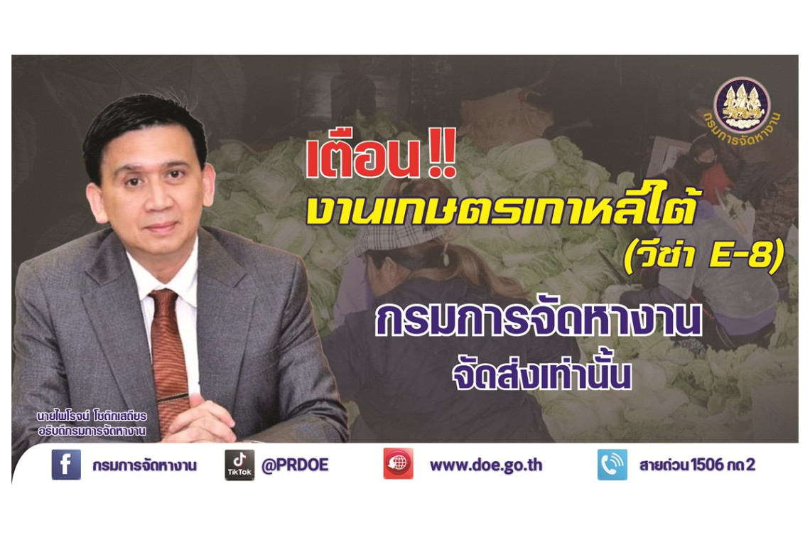 กรมการจัดหางานย้ำงานเกษตรเกาหลีใต้ (วีซ่า E-8) “กรมการจัดหางาน” จัดส่งเท่านั้น! อย่าหลงเชื่อลงทะเบียน + จ่ายเงินล่วงหน้าให้หน่วยงานหรือองค์กรใดที่อ้างว่าสามารถส่งไปทำงานได้ พร้อมแจงแนวทางจัดส่ง แรงงานไทยทำงานภาคเกษตรเกาหลีใต้ (วีซ่า E-8) ตาม MOU