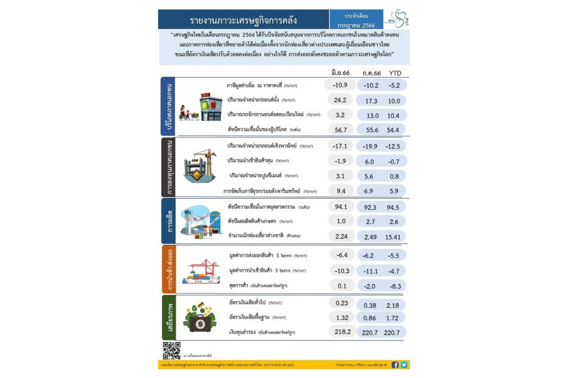 เศรษฐกิจการคลังเดือนก.ค.66 ได้รับปัจจัยสนับสนุนจากการบริโภคภาคเอกชนในหมวดสินค้าคงทน และภาคการท่องเที่ยวที่ขยายตัวได้ต่อเนื่องทั้งจากนักท่องเที่ยวต่างประเทศและผู้เยี่ยมเยือนชาวไทย ขณะที่อัตราเงินเฟ้อปรับตัวลดลงต่อเนื่อง อย่างไรก็ดี การส่งออกยังคงชะลอตัวตามภาวะเศรษฐกิจโลก