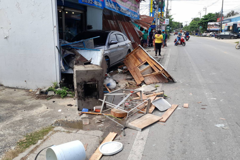 ในที่เกิดเหตุพบ รถยนต์เก๋ง ยี่ห้อ โตโยต้า ยาริส สีบรอนซ์เงิน ทะเบียน 3 ขด 5427 กรุงเทพมหานคร สภาพหน้ารถพังยับเยิน ที่หน้ารถพบร้านขายส้มตำ ถูกชนได้รับเสียหาย ข้าวของกระจัดกระจาย เต็มพื้น ที่กำแพงร้านตัดเย็บผ้ามีรอยแตกร้าว และในที่เกิดเหตุยังพบรถจักรยานยนต์ได้รับความเสียหายอีก 2 คัน รวมถึงศาลตายายที่ตั้งอยู่บริเวณหน้าร้าน โดยในที่เกิดเหตุมีผู้ได้รับบาดเจ็บ 2 ราย คือ นางปัดถา อายุ 67 ปี และ นางจิราธร อายุ 54 ปี เจ้าหน้าที่มูลนิธิให้การช่วยเหลือปฐมพยาบาล ส่งโรงพยาบาลราษฎร์บูรณะ ก่อนหน้าแล้ว ภาพจากล้องวงจรปิดริมถนน สามารถจับภาพรถยนต์เก๋งคันที่เกิดเหตุ ขับเสียการทรงตัวเข้ามาข้างทางก่อนจะพุ่งชนร้านขายส้มตำ