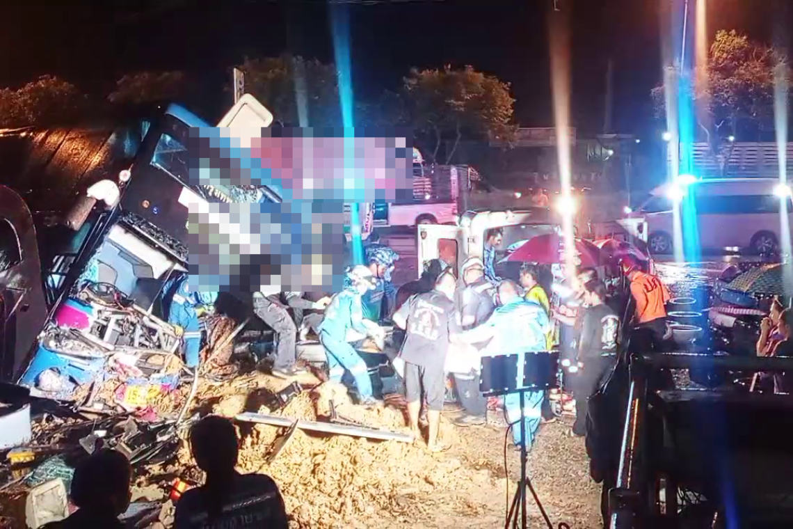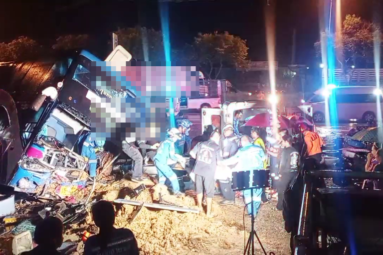 วันที่ 2 ก.ย.66 เวลา 00.40 น.ร.ต.อ.ธีรพร คงนวล รอง สว.(สอบสวน) สภ.ท่าแซะ จ.ชุมพร ได้รับแจ้งว่าเกิดอุบัติเหตุรถทัวร์โดยสารประจำทางเสียหลังพุ่งเหินข้ามเกาะกลางตกลงข้างทางริมถนนสายเพชรเกษม กม.ที่ 479+450 หมู่ 4 ตำบลหาดพันไกร อ.เมืองชุมพร จ.ชุมพร ทำให้มีผู้เสียชีวิตติดภายในรถและบาดเจ็บหลายราย จึงพร้อมด้วย เจ้าหน้าที่ตำรวจทางหลวงชุมพร รถแอมบลูแลนด์โรงพยาบาลชุมพรเขตรอุดมศักดิ์ หน่วยกู้ชีพกู้ภัยมูลนิธิชุมพรการกุศลสงเคราะห์นำเครื่องตัดถ่างเร่งตรวจสอบ