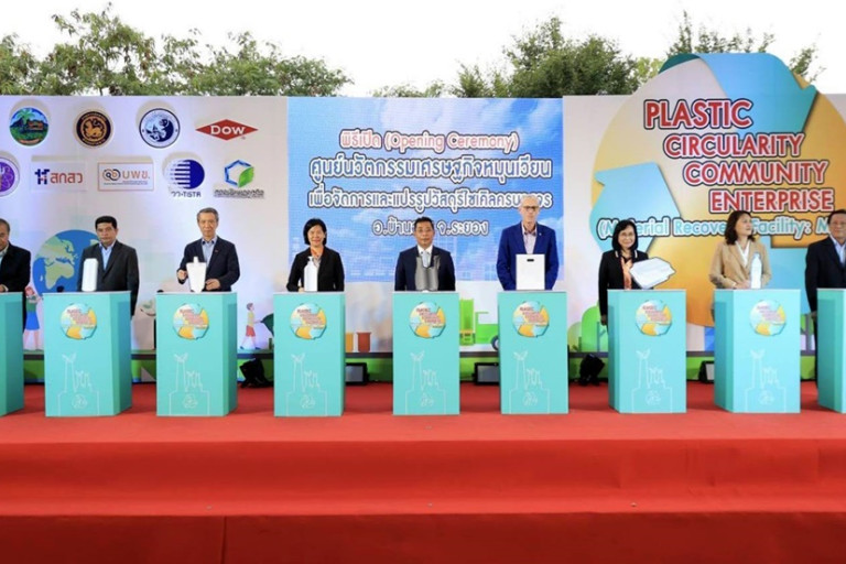 เมื่อวันที่ 6 ก.ย.66 นายไตรภพ วงศ์ไตรรัตน์ ผู้ว่าราชการจังหวัดระยอง เป็นประธานในพิธีเปิดอย่างเป็นทางการของ “ศูนย์นวัตกรรมเศรษฐกิจหมุนเวียนเพื่อจัดการและแปรรูปวัสดุรีไซเคิลครบวงจร (Material Recovery Facility: MRF)” ซึ่งเป็นต้นแบบแห่งแรกของประเทศไทยสำหรับการคัดแยกและยกระดับคุณภาพวัสดุรีไซเคิลเหลือใช้ในชุมชนด้วยนวัตกรรมและเทคโนโลยีฝีมือคนไทย พร้อมดำเนินการในรูปแบบ “ธุรกิจชุมชน” หรือ Community Enterprise ซึ่งก่อตั้งด้วยความร่วมมือจากทุกภาคส่วน ได้แก่ กลุ่มบริษัท ดาว ประเทศไทย (Dow) วว. บพข. สถาบันพลาสติก เทศบาลตำบลบ้านฉาง อำเภอบ้านฉาง และจังหวัดระยอง ตั้งเป้าแก้ปัญหาพลาสติกใช้แล้วและวัสดุรีไซเคิลในหลุมฝังกลบเพื่อนำกลับเข้าสู่กระบวนการรีไซเคิลในแต่ละปีกว่า 1,000 ตัน และลดการปล่อยก๊าซเรือนกระจกได้ถึง 2,400 ตันคาร์บอนไดออกไซด์เทียบเท่าต่อปี