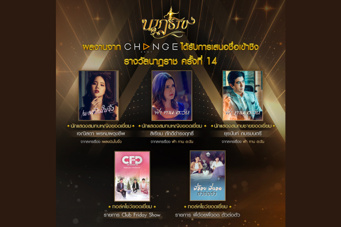 โดยงานนี้ทาง CHANGE2561 ก็ได้ขอแสดงขอบคุณสมาพันธ์สมาคมวิชาชีพวิทยุกระจายเสียงและวิทยุโทรทัศน์ ที่ให้เกียรติ รายการ Club Friday Show, รายการ พี่อ้อยพี่จอด ตัวต่อตัว , ละคร ฟ้า ทาน ตะวัน และละคร เพลงบินใบงิ้ว ร่วมเข้าชิงรางวัล และขอแสดงความยินดีกับทุกผลงานที่ได้ร่วมเข้าชิงมา ณ ที่นี้ด้วยค่ะ