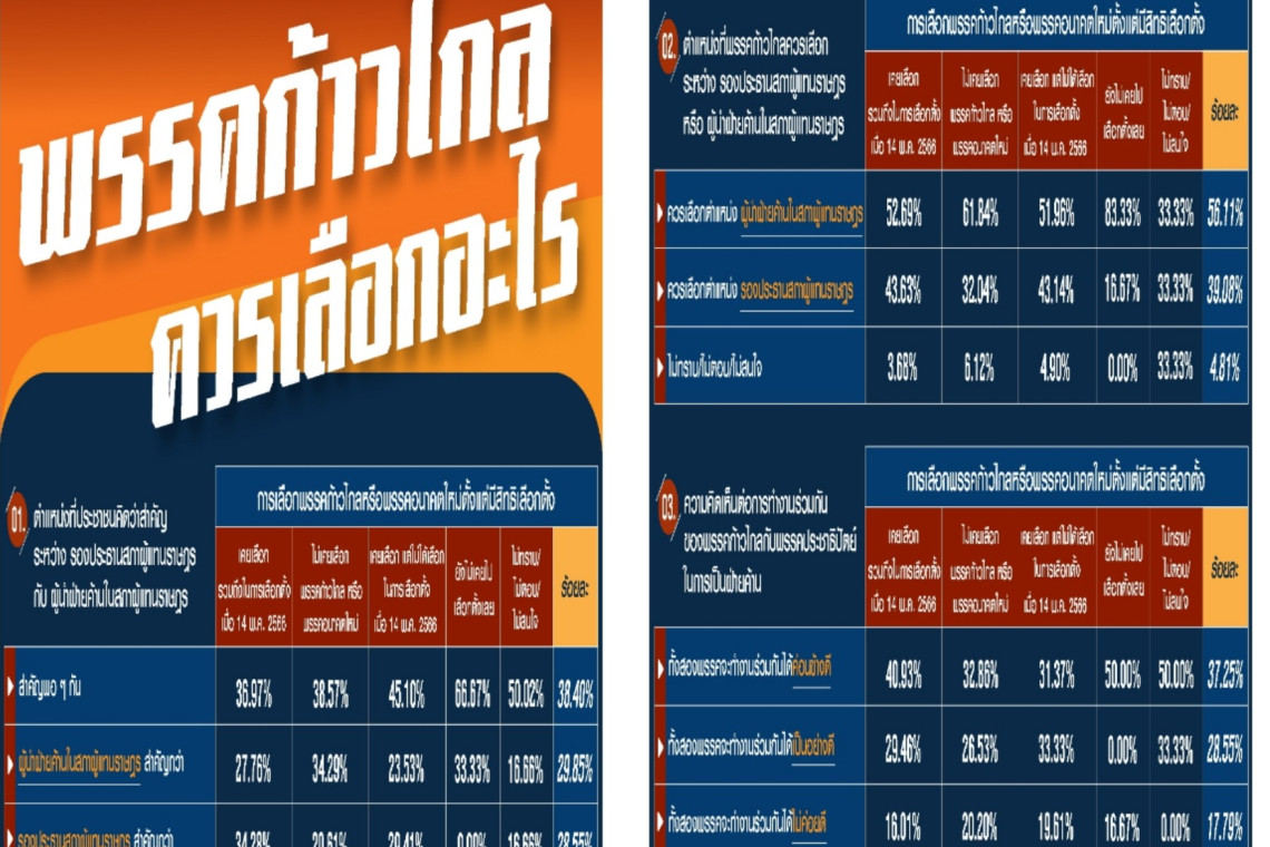 ท้ายที่สุดเมื่อถามความคิดเห็นของประชาชนต่อการทำงานร่วมกันของพรรคก้าวไกลกับพรรคประชาธิปัตย์ในการเป็นฝ่ายค้าน พบว่า ตัวอย่าง ร้อยละ 37.25 ระบุว่า ทั้งสองพรรคจะทำงานร่วมกันได้ค่อนข้างดี รองลงมา ร้อยละ 28.55 ระบุว่า ทั้งสองพรรคจะทำงานร่วมกันได้เป็นอย่างดี ร้อยละ 17.79 ระบุว่า ทั้งสองพรรคจะทำงานร่วมกันได้ไม่ค่อยดี ร้อยละ 12.82 ระบุว่า ทั้งสองพรรคจะไม่สามารถทำงานร่วมกันได้เลย และร้อยละ 3.59 ระบุว่า ไม่ทราบ/ไม่ตอบ/ไม่สนใจ