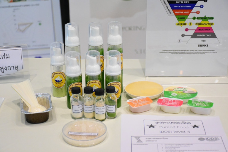 โฟมโปรตีนสูงเพื่อผู้สูงวัยจากข้าวหอมมะลิไทย เป็นนวัตกรรมอาหารที่ไม่เคยมีที่ใดมาก่อนในโลก ซึ่งโปรตีนจัดเป็นสารอาหารที่มีความจำเป็นในทุกช่วงอายุ โดยเฉพาะหน้าที่ในการเสริมสร้างกล้ามเนื้อ และสำหรับผู้สูงวัย เพื่อป้องกันไม่ให้ตกอยู่ในภาวะของโรคซาร์โคเพเนีย (Sarcopenia) ที่ทำให้กล้ามเนื้อลีบอาหารเล็กและอ่อนแรง ซึ่งปริมาณโปรตีนที่ผู้สูงวัยควรได้รับในแต่ละวันจึงจะเพียงพอคือ 1 - 1.2 กรัม ต่อน้ำหนักตัว 1 กิโลกรัม ซึ่งจะได้รับครบถ้วนเพียงฉีดโฟมโปรตีนสูงเพื่อผู้สูงวัยจากข้าวหอมมะลิไทย ใส่ช้อนชา และรับประทานได้ทันที เนื่องจากการศึกษาของสถาบันโภชนาการ มหาวิทยาลัยมหิดล ก่อนหน้าพบว่า ส่วนมากผู้สูงอายุได้รับโปรตีนน้อยกว่าปริมาณที่ควรได้รับ 8 - 10 กรัม ดังนั้นจึงแนะนำรับประทานให้ได้ในปริมาณ 1 - 2 ขวดต่อวัน (มีโปรตีน 5% ต่อ 100 มิลลิลิตรต่อขวด)