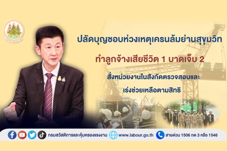 ปลัดกระทรวงแรงงานห่วงใยเหตุเครนล้มภายในโครงการก่อสร้างมหาวิทยาลัยย่านสุขุมวิททำให้ลูกจ้างเสียชีวิต 1 ราย บาดเจ็บ 2 ราย สั่งหน่วยงานในสังกัดลงพื้นที่ตรวจสอบหาสาเหตุและเร่งช่วยเหลือตามสิทธิพึงได้ โดยเรียกนายจ้างสอบ 21 กันยายนนี้