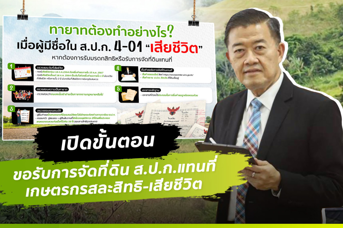 เลขาธิการ ส.ป.ก. ดร. วิณะโรจน์ ทรัพย์ส่งสุข เปิดเผยขั้นตอนขอรับการจัดที่ดินแทนที่เกษตรกรที่สละสิทธิหรือเสียชีวิตและสามารถดำเนินการผ่านช่องทางไหนได้บ้าง