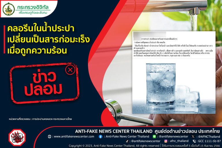 วันที่ 15 ก.ย.66 ศูนย์ต่อต้านข่าวปลอม ประเทศไทย | Anti-Fake News Center Thailand แจ้งว่า ตามที่มีข้อความในสื่อต่าง ๆ เกี่ยวกับประเด็นคลอรีนในน้ำประปาเปลี่ยนเป็นสารก่อมะเร็งเมื่อถูกความร้อน ทางศูนย์ต่อต้านข่าวปลอมได้ดำเนินการตรวจสอบข้อเท็จจริงกับการประปานครหลวง กระทรวงมหาดไทย พบว่าประเด็นดังกล่าวนั้น เป็นข้อมูลเท็จ