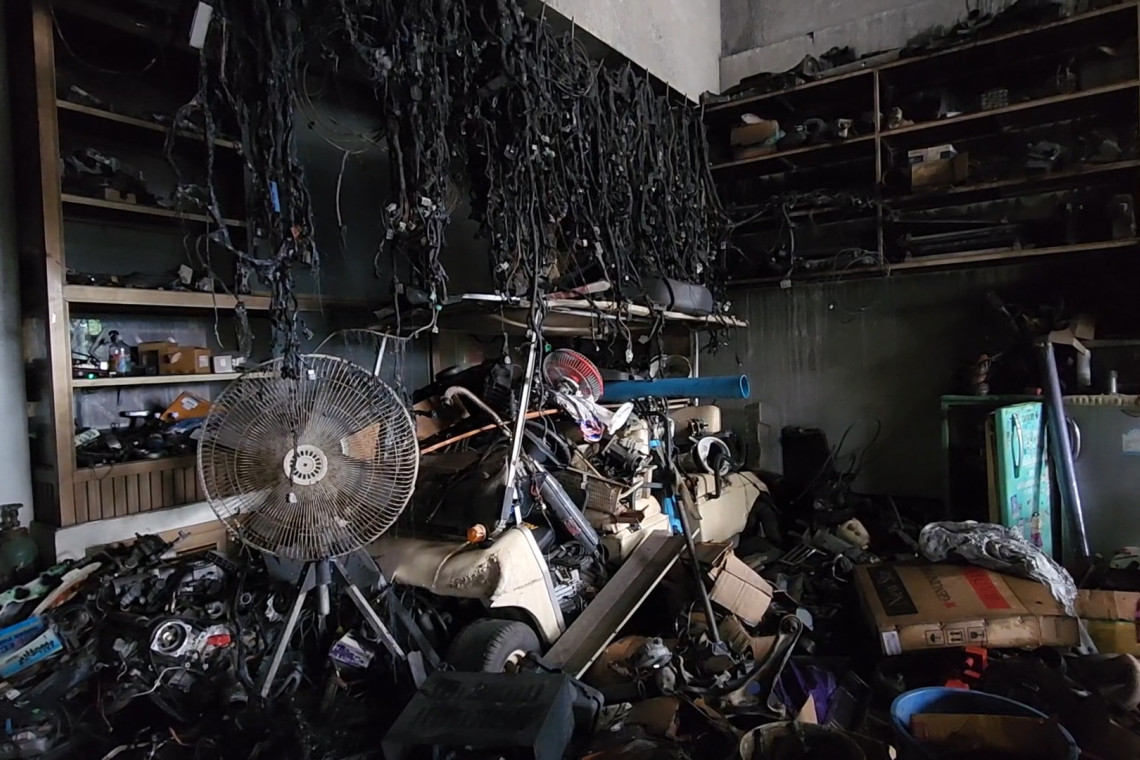 ไฟไหม้ร้านซ่อมแอร์รถยนต์ อุปกรณ์วอดทั้งร้าน ขณะที่รถลูกค้าจอดซ่อมด้านนอกหวิดโดนไฟลาม ยังไม่สามารถประเมินความเสียหายได้