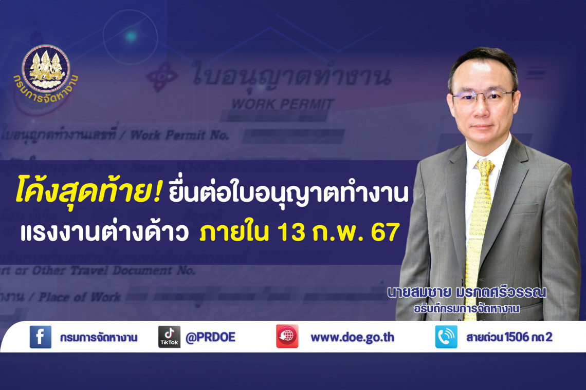 กรมการจัดหางานเตือนแรงงาน 4 สัญชาติ ตามมติ ครม.เมื่อวันที่ 5 กรกฎาคม 2565 ที่ใบอนุญาตทำงานจะหมดอายุ ภายในวันที่ 13 ก.พ.67 เร่งต่ออายุใบอนุญาตทำงาน ที่เว็บไซต์ e-workpermit.doe.go.th ก่อนใบอนุญาตทำงานสิ้นอายุ