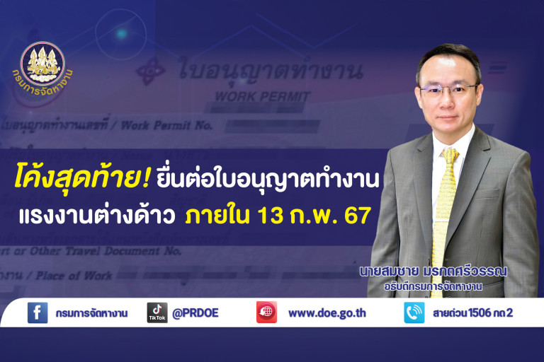 “กรมการจัดหางานยืนยันว่าไม่มีการขยายระยะเวลา หากต้องการให้แรงงานของท่านทำงานต่อไปถึงวันที่ 13 ก.พ.2568 ให้เร่งดำเนินการยื่นเอกสารต่ออายุใบอนุญาต ภายในกำหนด มิฉะนั้นการอนุญาตให้อยู่ในราชอาณาจักรและทำงานจะเป็นอันสิ้นสุด แรงงานต่างด้าวต้องเดินทางกลับประเทศต้นทางและหากประสงค์จะกลับเข้ามาทำงานในประเทศไทย ต้องดำเนินการตามกระบวนการนำเข้า MOU” อธิบดีกรมการจัดหางานกล่าว