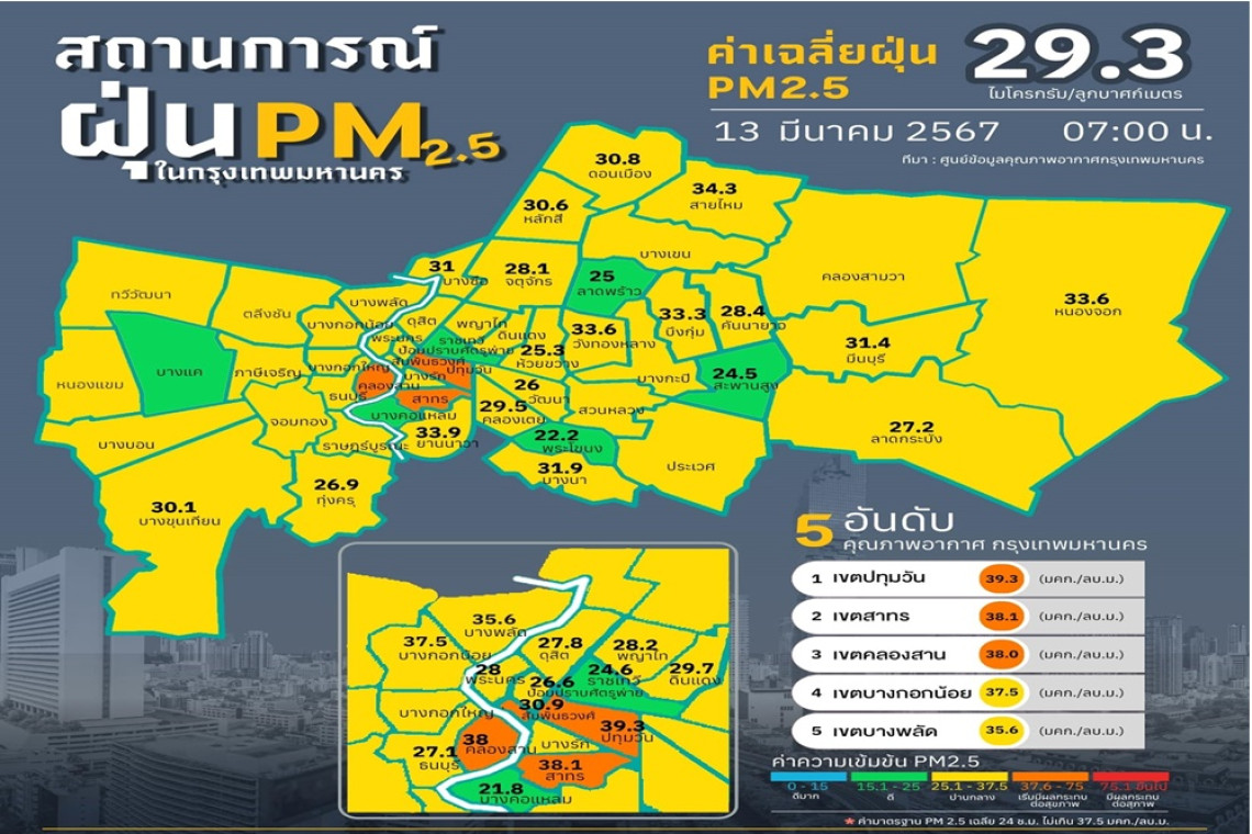 วันที่ 13 มี.ค.67 ศูนย์ข้อมูลคุณภาพอากาศกรุงเทพมหานครขอสรุปผลการตรวจวัด PM2.5 วันที่ 13 มี.ค. 2567 เวลา 05.00-07.00 น.ตรวจวัดได้ 19.7-39.4 มคก./ลบ.ม. ค่าเฉลี่ยของกรุงเทพมหานคร 29.4 มคก./ลบ.ม.