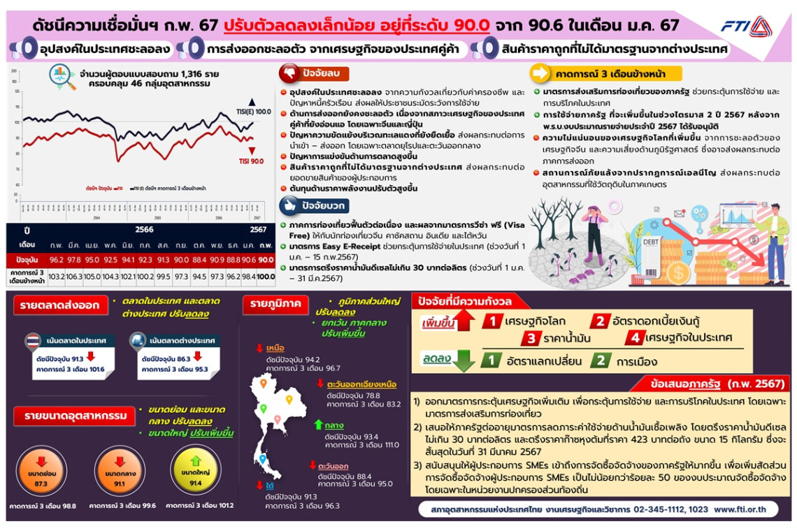 นายอิศเรศ รัตนดิลก ณ ภูเก็ต รองประธานสภาอุตสาหกรรมแห่งประเทศไทย (ส.อ.ท.) และนายพิตติพัตน์ มั่นบุปผชาติ รองเลขาธิการสภาอุตสาหกรรมแห่งประเทศไทย (ส.อ.ท.) ร่วมเปิดเผยผลการสำรวจดัชนีความเชื่อมั่นภาคอุตสาหกรรมในเดือนกุมภาพันธ์ 2567 อยู่ที่ระดับ 90.0 ปรับตัวลดลงเล็กน้อย จาก 90.6 ในเดือนมกราคม 2567 ทั้งนี้เมื่อพิจารณาองค์ประกอบของดัชนีฯ พบว่ายอดขายโดยรวม คำสั่งซื้อโดยรวม ปริมาณการผลิต และผลประกอบการ ปรับตัวลดลงจากเดือนก่อนหน้า โดยมีปัจจัยลบจากอุปสงค์ในประเทศที่ชะลอตัวลงจากเดือนก่อนหน้า เนื่องจากความกังวลเกี่ยวกับค่าครองชีพและปัญหาหนี้ครัวเรือน ส่งผลให้ประชาชนระมัดระวังการใช้จ่าย ด้านการส่งออกยังคงชะลอตัว เนื่องจากสภาวะเศรษฐกิจของประเทศคู่ค้าที่ยังอ่อนแอ โดยเฉพาะจีนและญี่ปุ่น ประกอบกับปัญหาความขัดแย้งบริเวณทะเลแดง ยังคงยืดเยื้อส่งผลกระทบต่อการนำเข้า-ส่งออกของไทยโดยเฉพาะตลาดยุโรปและตะวันออกกลาง นอกจากนี้ผู้ประกอบการยังเผชิญปัญหาการแข่งขันด้านการตลาดสูงขึ้น รวมถึงได้รับผลกระทบจากสินค้าราคาถูกที่ไม่ได้มาตรฐานจากต่างประเทศ ส่งผลให้ยอดขายสินค้าของผู้ประกอบการไทยลดลง ขณะที่ต้นทุนด้านราคาพลังงานปรับตัวสูงขึ้น