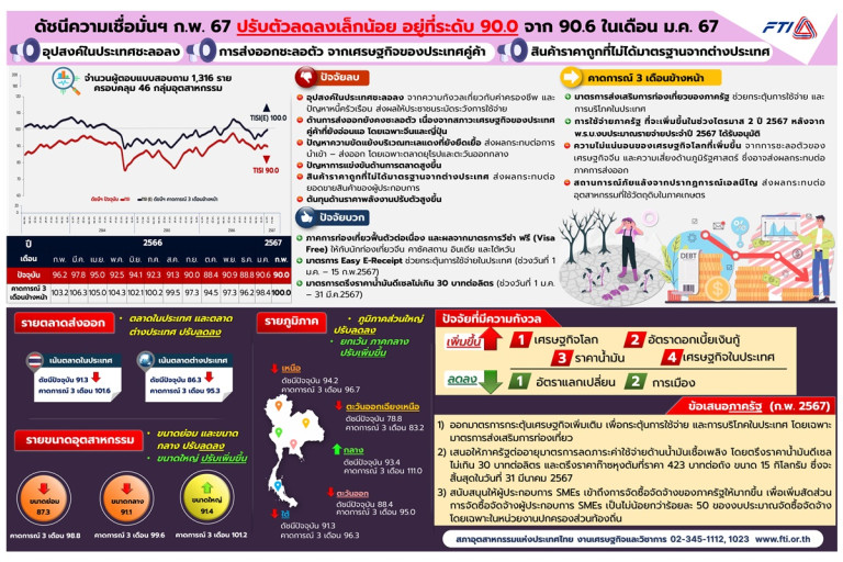 ขณะที่ดัชนีฯคาดการณ์ 3 เดือนข้างหน้า อยู่ที่ระดับ 100.0 ปรับตัวเพิ่มขึ้น จาก 98.4 ในเดือนมกราคม 2567 โดยมีปัจจัยสนับสนุนจากมาตรการส่งเสริมการท่องเที่ยวของภาครัฐ ช่วยกระตุ้นการใช้จ่ายและการบริโภคในประเทศ ขณะที่การใช้จ่ายภาครัฐ ที่จะเพิ่มขึ้นในช่วงไตรมาส 2 ปี 2567 หลังจากพ.ร.บ.งบประมาณรายจ่าย ประจำปีงบประมาณ 2567 ได้รับอนุมัติ แต่อย่างไรก็ตามยังมีปัจจัยที่ต้องติดตาม ได้แก่ ความไม่แน่นอนของเศรษฐกิจโลกที่เพิ่มขึ้นจากการชะลอตัวของเศรษฐกิจจีน และความเสี่ยงด้านภูมิรัฐศาสตร์ ซึ่งอาจส่งผลกระทบต่อภาคการส่งออก ขณะที่สถานการณ์ภัยแล้งจากปรากฏการณ์เอลนีโญ (El Niño) อาจส่งผลกระทบต่ออุตสาหกรรมที่ใช้วัตถุดิบในภาคเกษตรและปริมาณน้ำในภาคอุตสาหกรรม