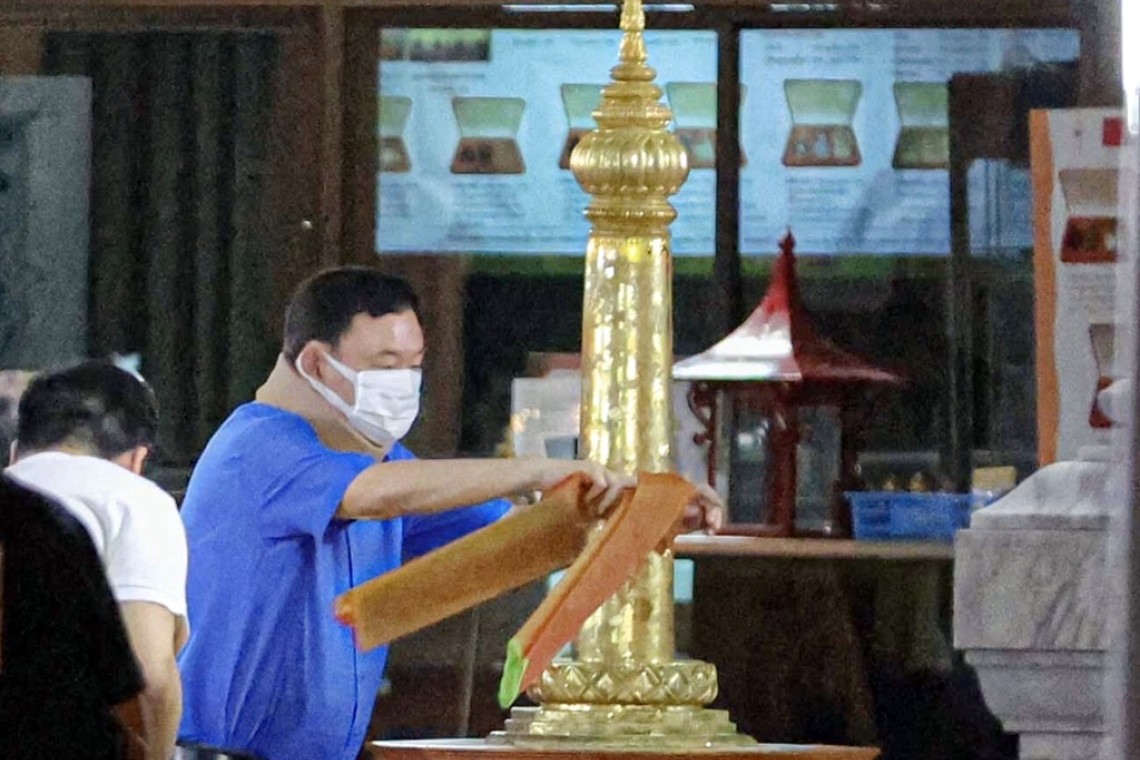 ผู้สื่อข่าวรายงานว่า นายทักษิณ ใช้เวลาสักกาละ 26 นาที ก่อนเดินทางกลับ ในเวลา 5.45 น. ทั้งนี้ในระหว่างที่นายทักษิณ เดินมาขึ้นรถ ได้หันมาทางด้านสื่อมวลชน พร้อมยกมือไหว้ ก่อนขึ้นรถกลับด้วยรถตู้เบนซ์ สีดำ ภษ 1414 กทม.