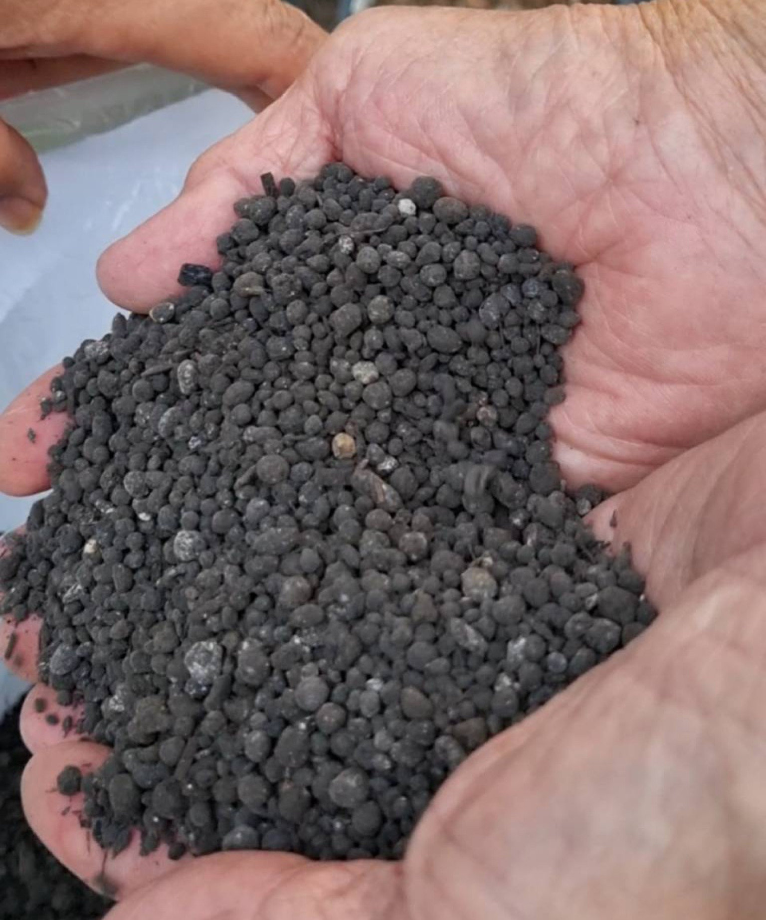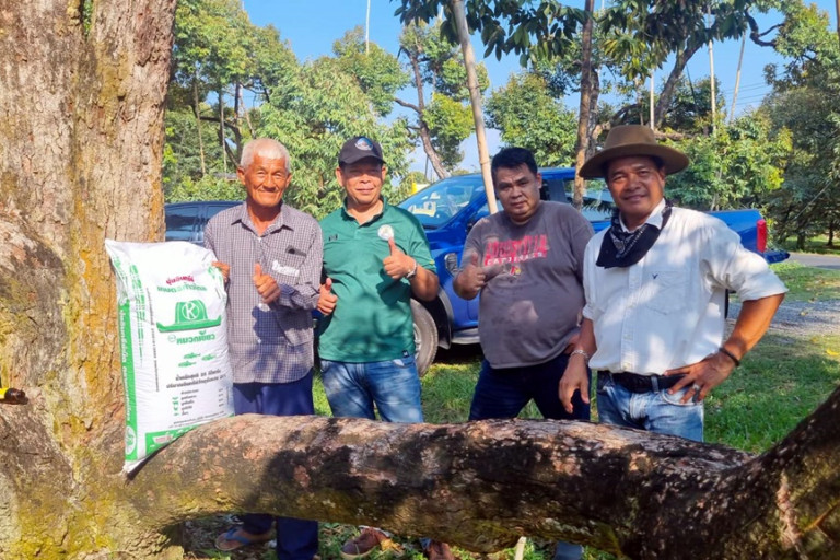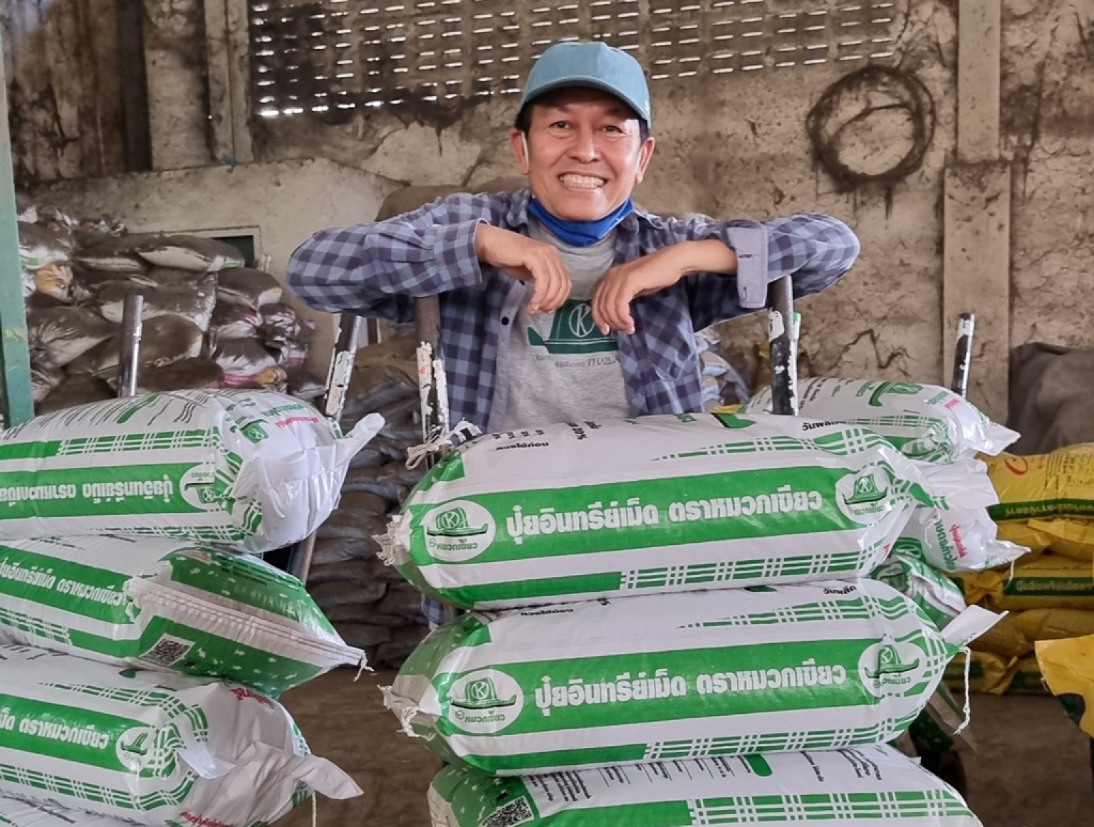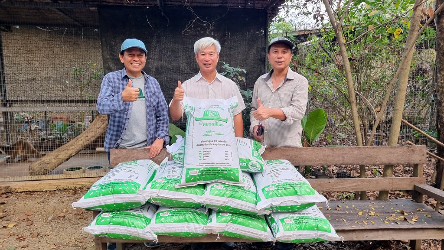 “อย่างปุ๋ยอินทรีย์เกษตรก้าวไกล เราใช้วัตถุดิบคุณภาพที่ผ่านการใช้งานในแปลงจริง จากปุ๋ยแบรนด์อื่นๆที่เราผลิต ว่าใช้แล้วได้ผลจริง เช่น มีกากตะกอนโรงงานปลากระป๋องสูงถึง 20 % และนำมาหมักกับจุลินทรีย์ทรีย์อย่างน้อย 8-12 เดือน หรือ 1 ปี และพ่นสเปรย์จุลินทรีย์ระหว่างขั้นตอนการผลิต โดยจุลินทรีย์บางตัวมีคุณสมบัติช่วยยับยั้งต้านทานไฟทอปธอร่าหรือโรครากเน่าโคนเน่าที่มักเกิดกับทุเรียน และส่วนผสมในกระสอบยังมีมูลโคขุน 30% มูลไก่ไข่ 20% และโดยเฉพาะมูลค้างคาว 30% ซึ่งเป็นมูลค้างคาวกินแมลงที่ส่งตรงมาจากถ้ำจังหวัดกระบี่นำมาหมักกองเป็นภูเขา..”
