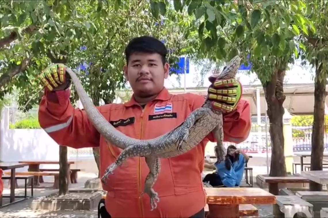 วันนี้ (15 มี.ค.67) เจ้าหน้าที่บรรเทาสาธารณภัย เทศบาลนครอุดรธานี รับแจ้งมีสัตว์เลื้อยคลาน (ตัวเหี้ยหรือตะกวด) บุกเข้าไปในโรงเรียนสตรีราชินูทิศ เขตเทศบาลนครอุดรธานี จึงรีบเดินทางไปตรวจสอบช่วยเหลือนำออกจากโรงเรียนทัน โดยตัวเหี้ยนอนอยู่หลบซ่อนตัวที่ใต้อัฒจันทร์ข้างสนามกีฬา ไม่กล้าวิ่งไปไหนอีก เจ้าหน้าที่จึงค่อยๆ พยายามใช้บ่วงอุปกรณ์พยายามเข้าจับ แต่มันได้ใช้ปากคาบเอาไว้ไม่ยอมให้จับโดยดี ระหว่างนั้นเจ้าหน้าที่ฯได้ใช้มือกำที่คอและสามารถจับตัวได้ วัดความยาวคร่าวๆได้ 100 เซนติเมตร น้ำหนักราว 3 กิโลกรัม ก่อนจับมัดนำไปปล่อยป่าใกล้เมืองต่อไป หลังถูกจับเจ้าหน้าที่ได้ชูตัวเหี้ยขึ้นโดยหันท้องออกมา และสังเกตเหตพบว่าที่ใต้ท่องมีลักษณะคล้ายตัวเลข 80 08