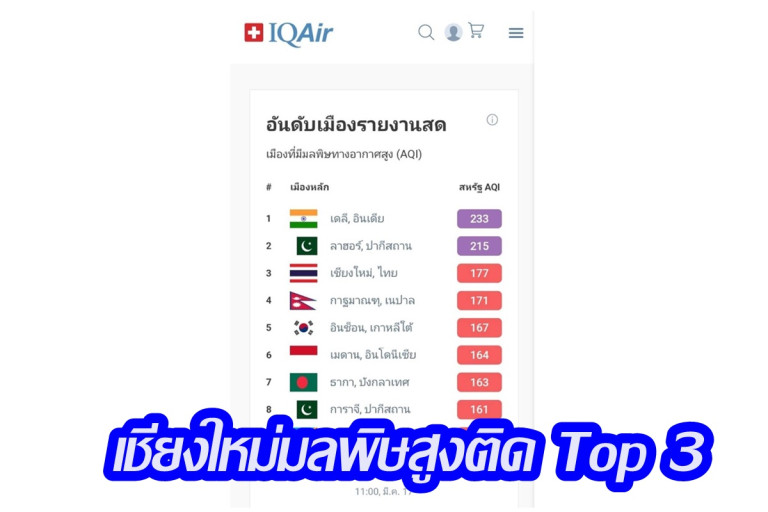 มลพิษในเชียงใหม่ยังไม่แผ่ว พุ่งสูงต่อเนื่องมาหลายวัน โดยล่าสุด เว็บไซต์ IQAir รายงานคุณภาพอากาศของทั่วโลก เมื่อเวลา 11.00 น. พบว่า "เชียงใหม่" ประเทศไทย มีมลพิษสูงติด Top 3 เมืองใหญ่ที่มีมลพิษมากที่สุดในโลก โดยมีค่า AQI ติดอยู่อันดับ 3 ของโลกที่ 177 อยู่ในระดับสีแดง (AQI = 151-200) หรือมีผลกระทบต่อทุกคน ส่วนเมืองใหญ่ที่มลพิษทางอากาศสูงอันดับ 1 คือ เมืองเดลี ประเทศอินเดีย ค่า AQI วัดได้ 233 อยู่ในระดับสีม่วง (AQI = 201-300) หรือมีผลกระทบต่อทุกคนอย่างรุนแรง ส่วนอันดับ 2 คือ เมืองลาฮอร์ ประเทศปากีสถาน ค่า AQI วัดได้ 215 อยู่ในระดับสีม่วงเช่นกัน