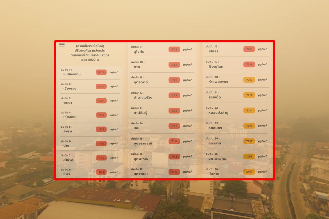 กระทรวงการอุดมศึกษา วิทยาศาสตร์ วิจัยและนวัตกรรม (อว.) โดยสำนักงานพัฒนาเทคโนโลยีอวกาศและภูมิสารสนเทศ (องค์การมหาชน) หรือ GISTDA ร่วมกับสำนักงานการวิจัยแห่งชาติ, กรมควบคุมมลพิษ, มหาวิทยาลัยเกษตรศาสตร์ และมหาวิทยาลัยเชียงใหม่ เกาะติดสถานการณ์ฝุ่น PM 2.5 แบบรายชั่วโมง ด้วยข้อมูลจากดาวเทียมผ่านแอปพลิเคชั่น “เช็คฝุ่น” เมื่อเวลา 08.00 น. ของวันที่ 18 มีนาคม 2567 พบ 19 จังหวัดภาคเหนือ มีค่าฝุ่นเกินเกณฑ์มาตรฐานในระดับสีแดง มีผลกระทบต่อสุขภาพและระบบทางเดินหายใจ อาทิ #แม่ฮ่องสอน 160.6 ไมโครกรัม #เชียงราย 148.8 ไมโครกรัม #พะเยา 135.4 ไมโครกรัม #เชียงใหม่ 135.2 ไมโครกรัม #ลำพูน 131.7 ไมโครกรัม #น่าน 114.6 ไมโครกรัม #ลำปาง 112 ไมโครกรัม #แพร่ 94.5 ไมโครกรัม #สุโขทัย 93.8 ไมโครกรัม #ตาก 92.2 ไมโครกรัม #อุตรดิตถ์ 85.5 ไมโครกรัม #อำนาจเจริญ 82.7 ไมโครกรัม #กาฬสินธุ์ 82.3 ไมโครกรัม #เลย 82.2 ไมโครกรัม #อุบลราชธานี 81.0 ไมโครกรัม #มุกดาหาร 79.3 ไมโครกรัม #นครพรม 77.6 ไมโครกรัม #ยโสธร 76.5 ไมโครกรัม #พิษณุโลก 75.9 ไมโครกรัม