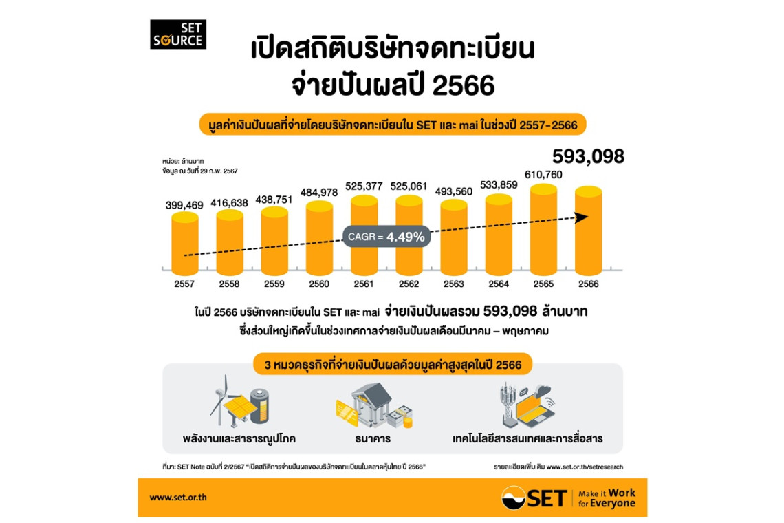 ตลท.เปิดตัวเลขปี 66 บริษัทจดทะเบียนในตลาดหุ้นไทยจ่ายเงินปันผล 593,098 ล้านบาท หมวดพลังงานและสาธารณูปโภครับอู้ฟู่