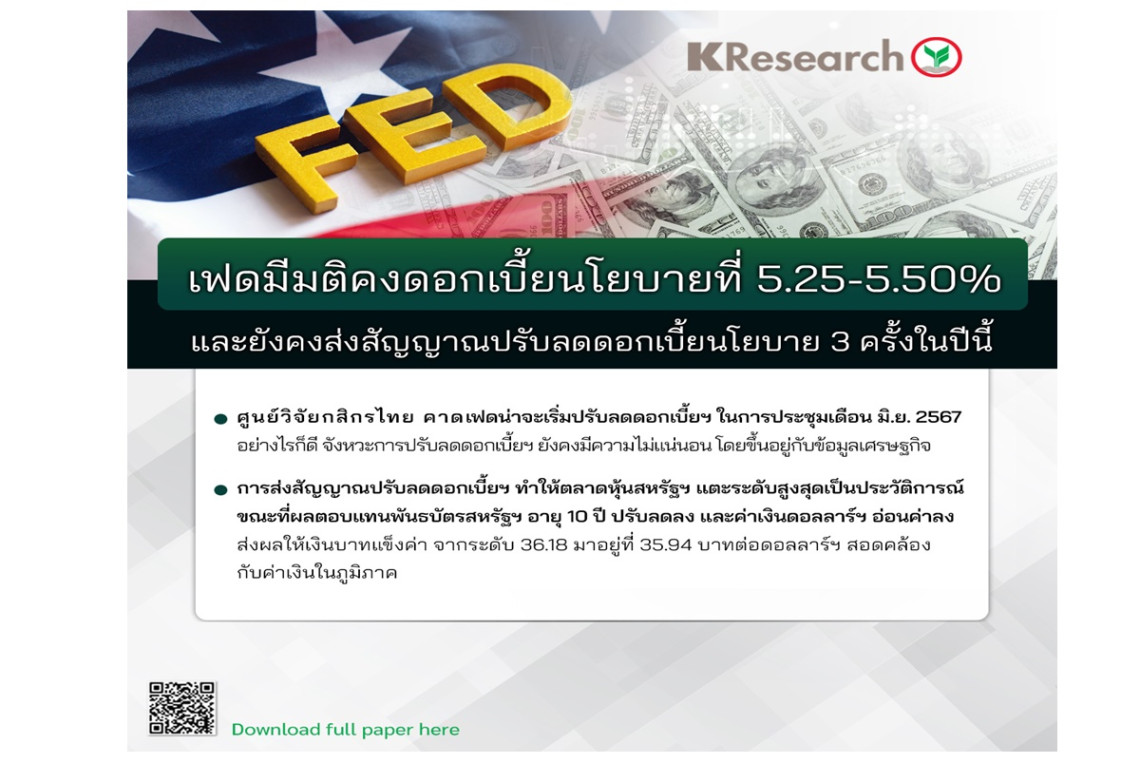 ​เฟดมีมติคงดอกเบี้ยนโยบายที่ 5.25-5.50% และยังคงส่งสัญญาณปรับลดดอกเบี้ยนโยบาย 3 ครั้งในปีนี้