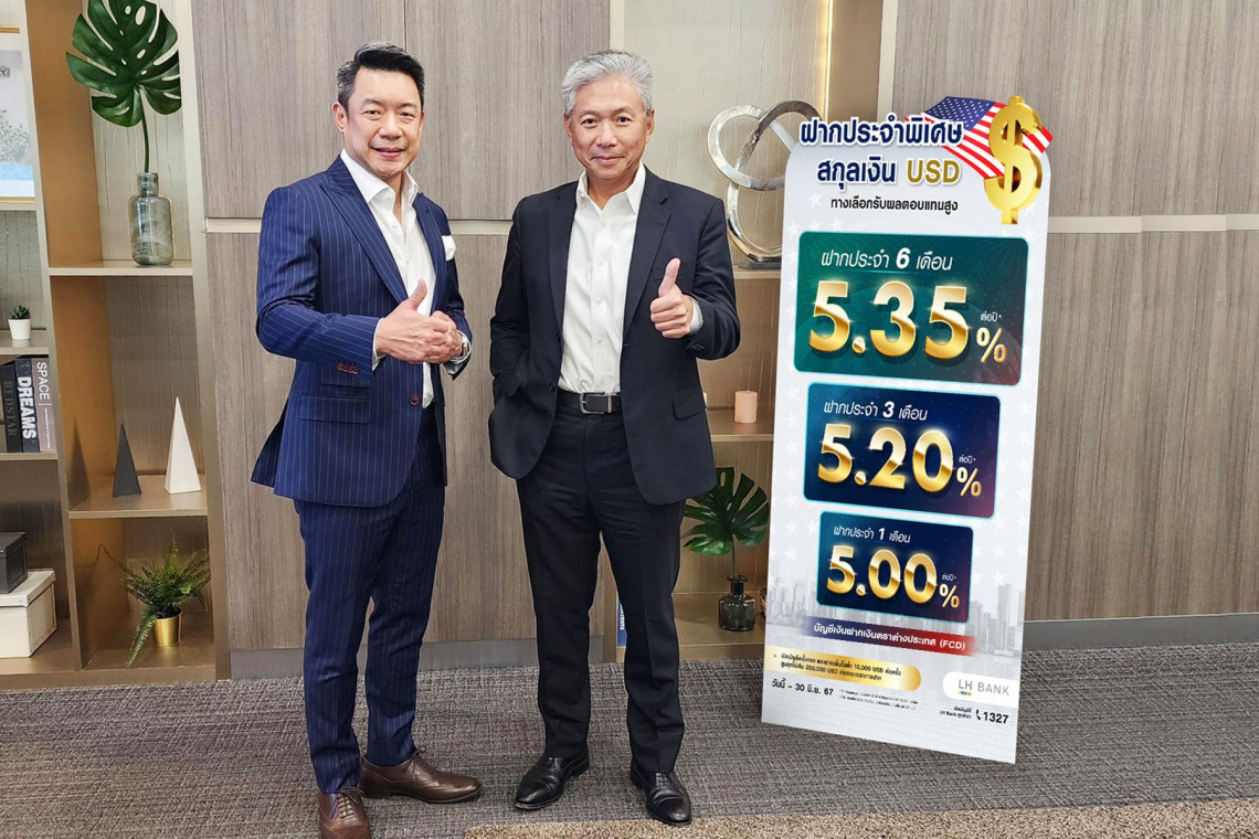 ธนาคารแลนด์ แอนด์ เฮ้าส์ จำกัด (มหาชน) หรือ LH Bank โดยนายฉี ชิง-ฟู่ ประธานเจ้าหน้าที่บริหารและกรรมการผู้จัดการ (ขวา) เปิดเผยว่า ธนาคารเดินหน้าพัฒนาผลิตภัณฑ์พร้อมมอบประสบการณ์ทางการเงินที่ตอบโจทย์ทุกความต้องการของลูกค้า ออกผลิตภัณฑ์เงินฝากประจำพิเศษเงินตราต่างประเทศ (FCD) สกุลเงิน US Dollar ชูดอกเบี้ยสูงสุด 5.35% ต่อปี สำหรับลูกค้าบุคคลธรรมดา ผู้ถือเงินสกุลดอลลาร์สหรัฐที่ต้องการรับผลตอบแทนสูงขึ้นเมื่อเทียบกับบัญชีสกุลเงินบาททั่วไป และมีความสนใจวางแผนการลงทุนผ่านบัญชีเงินฝากต่างประเทศ Foreign Currency Deposit (FCD) ด้วยอัตราดอกเบี้ยที่สูงโดนใจ เพื่อให้ลูกค้าสามารถวางแผนและสร้างโอกาสในการลงทุนด้วยสกุลเงินต่างประเทศ ท่ามกลางสภาวะการแข่งขันของตลาดทางการเงิน สกุลเงินต่างประเทศได้อย่างมีประสิทธิภาพ