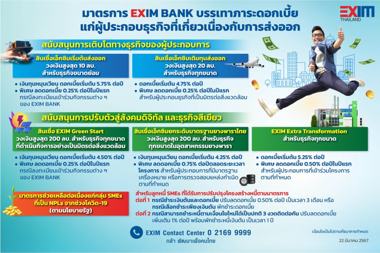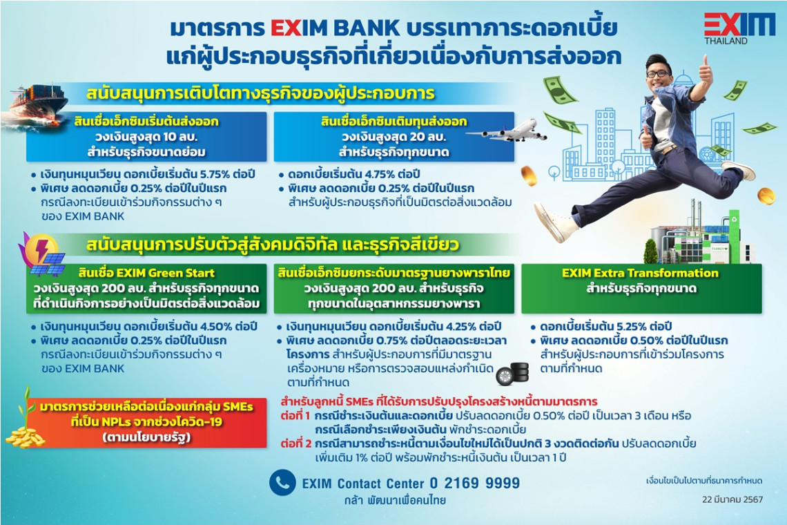ทั้งนี้ EXIM BANK พร้อมเคียงข้างและสนับสนุนผู้ประกอบการไทยให้มีสภาพคล่องในการดำเนินธุรกิจ บรรเทาภาระหนี้และต้นทุนทางธุรกิจ และปรับตัวให้สามารถแข่งขันได้อย่างยั่งยืนในเวทีการค้าโลกที่เต็มไปด้วยความท้าทายและโอกาสใหม่ ๆ ทางธุรกิจ สอบถามรายละเอียดเพิ่มเติมได้ที่ EXIM Contact Center โทร. 0 2169 9999 Email : contactcenter@exim.go.th