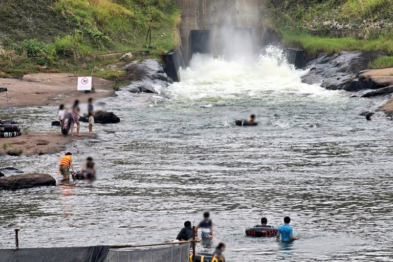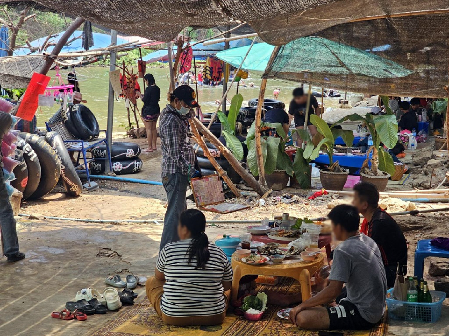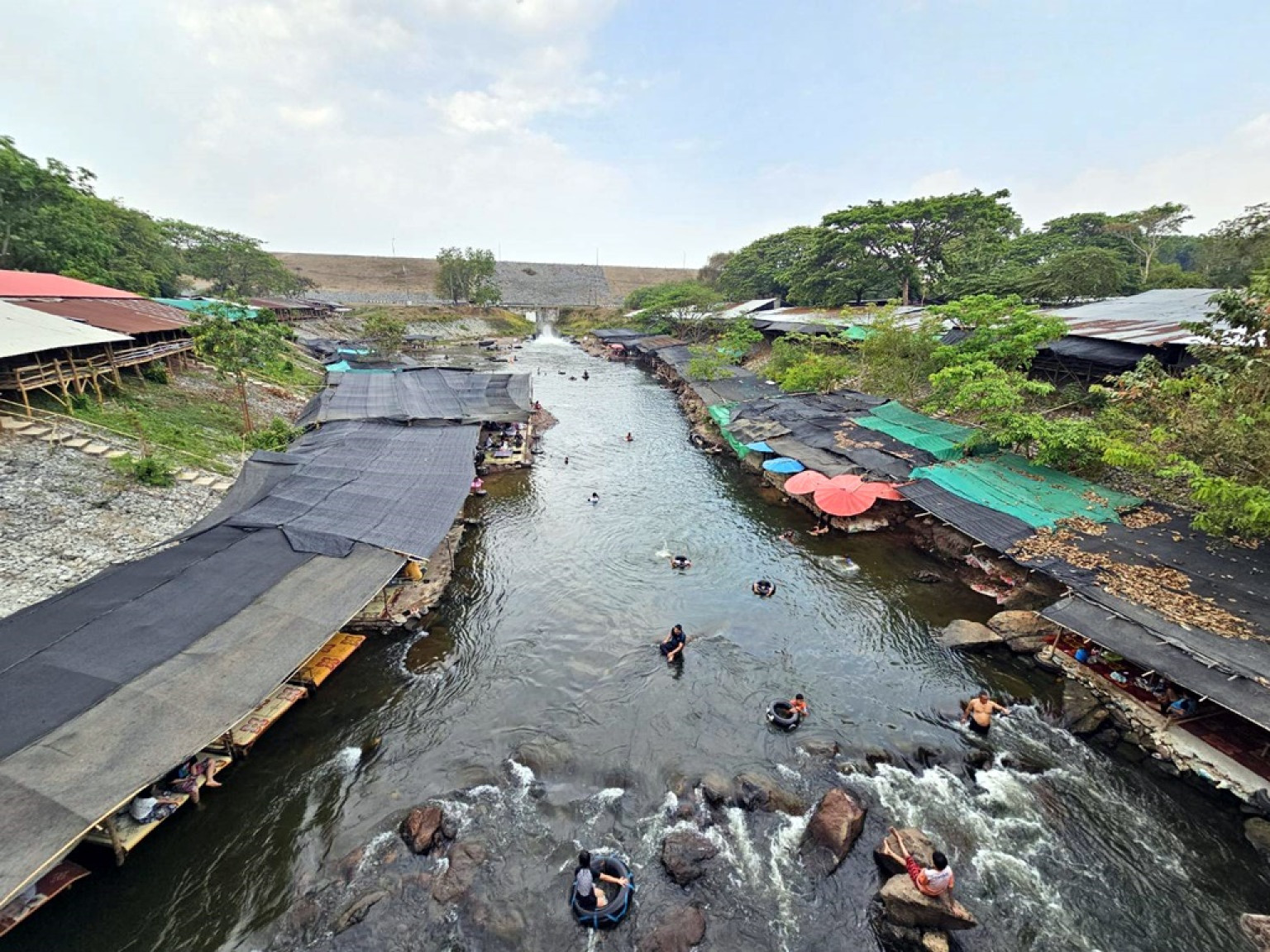 วันที่ 24 มี.ค.67 ที่บริเวณจุดผันน้ำสู่แหล่งน้ำธรรมชาติของเขื่อนลำปาว ประชาชนในพื้นที่ จ.กาฬสินธุ์และนักท่องเที่ยวจำนวนมาก ลงเล่นน้ำคลายร้อนแน่นขนัด หลังจากคลื่นความร้อนได้แผ่กระจายปกคลุมทั่วภาคอีสานในช่วงหน้าแล้งนี้ มีการให้เช่าห่วงยางเพื่อคอยบริการนักท่องเที่ยวตลอดลำน้ำ มีจุดปักไม้บอกความลึกไว้เตือนนักท่องเที่ยว มีเจ้าหน้าที่สอดส่องดูแลความปลอกภัย ตลอดลำน้ำประมาณ 1 กิโลเมตร มีร้านอาหารอีสาน เปิดเรียงรายทอดยาวไว้คอยต้อนรับนักท่องเที่ยวไว้จำนวนมาก มีเมนูปิ้ง ย่าง เผา ตำ นึ่ง อ่อม เมนูเด็ดต่างๆอาหารพื้นถิ่น หนึ่งในนั้น พบยายถือตระกร้าที่ใส่กุ้งโคโยตี้ หรือ กุ้งเต้นสดๆ ที่นำมาทำก้อยกุ้งสดจำหน่ายในราคาจานละ 60 บาท จะทำทานเองก็ได้ หรือจะบอกรสชาติที่ถูกปากสั่งยายได้ตามใจชอบ