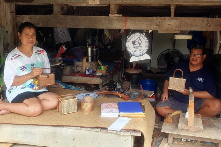 เราก็ภูมิใจนะครับว่างานของภูมิปัญญาบรรพบุรุษเราสามารถที่จะขายได้เป็นหมื่นเป็นแสนโดยที่เราไปจุดประกายให้กลุ่มต่างๆ ปีนึงอ่ะเราทำได้ไม่เกิน 4 ลูกไม่เกินนั้น แต่ถ้าอยากได้ต้องทำได้เยอะครับทำได้ปีนึงก็ประมาณ 10 กว่าลูกเนี่ยสบายๆ 15 ลูกก็ได้ครับ 3 เส้นมิลเนี่ยคือ แบบนี้ เส้นแบบนี้แล้วเราก็ไปแปะที่มิลลิเมตร แบบนี้มันจะ 3 เส้นมิล และแบบ 4 เส้นนึงก็คือ 4 เส้นเอามาทาบกันแล้วก็ไปวัดที่มิลลิเมตรครับเพื่อความละเอียดที่ๆ ที่เราทำกันอยู่ซึ่งคนอื่นๆก็อาจจะเนี่ยเดี๋ยวจะหาว่าเราโกหกนี่ นี่คือความยาวของเขาที่เราทำเส้นหวายประมาณ 4 เมตร 20 ความยาวเสาต้นตามความยาวทั้งต้นนะครับไม่ใช่ทำแค่ครึ่ง ตอนนี้มีสมาชิกทั้งหมดประมาณ 15 คนทั้งคนแก่แล้วก็เด็กด้วยเด็กก็สอนแต่ว่าบางคนก็ไม่เอาเพราะว่าเขาทำเขาจ้องจะให้เราประกอบประกอบให้แต่เราเองน่ะเราไม่มีเวลาแต่ไม่ใช่ว่าเราไม่สอนแล้วสอนทุกขั้นตอนไม่ว่าคุณอยากได้แบบไหนแล้วบอกแล้วว่าไม่ต้องมาทำเหมือนกันเราไม่จำเป็นเลยทำตะกร้าทำบุญหรือว่าทำตะกร้าแบบไม่มีฝาเนี่ยโดยที่ไม่ต้องมานั่งจ้างอาจารย์โดยที่ทำเองได้แล้วก็ไม่ได้เป็นมาเป็นภาระเราเราก็จะสอนให้ทั้งหมดไม่ว่าจะเป็นแบบโบราณทุกขั้นตอนตั้งแต่ทำที่ทำหวายแล้วก็ทำไม้หรือทำวงโลหะ เราสามารถสอนได้ทั้งหมดไม่อัดแบบโบราณแบบอัดแบบเป็นโครงลวดเราก็สอนให้ได้ถ้าอยากเรียนต้องการแต่ส่วนมากของเราเองเราจะ ไม่อยากให้เป็นโลหะ เพราะถ้าเป็นโลหะปุ๊บเนี่ยมันกัดมันจะกินตัวถ้าคนดูแลรักษาไม่ดี มันจะผุเพราะปลูกปุ๊บเนี่ยมันไม่สามารถที่จะไปทำอะไรได้เลยตัวผนังเขาขาดแล้วไม่สามารถที่จะเปลี่ยนได้ไม่สามารถที่จะซ่อมได้แต่ถ้าไม่เป็นโลหะเป็นไม้มันจะไม่กัดตัวกันแล้วผ้าเช็ดหน้าจะบิดน้ำหนักๆเช็ดทำความสะอาดแล้วห่อใส่ถุงแล้วเก็บได้เลยครับถึงเวลาจะใช้ก็ให้อาแปะถุงออกแล้วเราก็เอาไปใช้ปกติพอกลับมาแล้วก็มาเช็ดทำความสะอาดแล้วเข้าตู้ เอาถุงพลาสติกหุ้ม หวายมันมี 2 ชนิดครับมันมีบางคนก็ว่าเป็นหญ้าลิเภา แต่เราไม่ใช่คนเรามันมีหวายดำกับ หวายขาวคุณสมบัติของหวายขาวจะดีกว่าหวายดำตรงที่ว่า เขาสามารถเปลี่ยนสีได้มันจะเป็นกลายเป็นสีทองได้เหลืองเป็นทองเลยนะไม่ใช่เหลืองเป็นจีวรพระไม่ใช่มันจะเหลืองเองโดยธรรมชาติแต่เราต้องดูแลรักษานะไม่ใช่ว่าใช้เสร็จแล้วเอาไปตั้งโดนฝนโดนนู่นนี่นั่นมั่งอันนั้นน่ะมันไม่เหลือหรอกมันจะดำ เพราะว่ามันเป็นลายังไงก็เป็นลาเราไม่สามารถที่จะไม่ต้องการเวลามันได้
