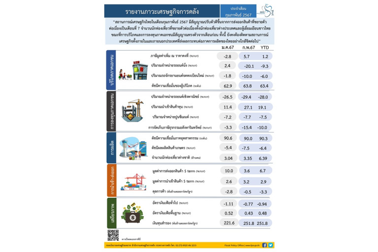 นายพรชัย ฐีระเวช ผู้อำนวยการสำนักงานเศรษฐกิจการคลัง เปิดเผยภาวะเศรษฐกิจการคลังประจำเดือนกุมภาพันธ์ 2567 ว่า “สถานการณ์เศรษฐกิจไทยในเดือนกุมภาพันธ์ 2567 มีสัญญาณปรับตัวดีขึ้นจากการส่งออกสินค้าที่ขยายตัวต่อเนื่องเป็นเดือนที่ 7 จำนวนนักท่องเที่ยวที่ขยายตัวต่อเนื่องทั้งนักท่องเที่ยวต่างประเทศและผู้เยี่ยมเยือนชาวไทย ขณะที่การบริโภคและการลงทุนภาคเอกชนมีสัญญาณทรงตัวจากเดือนก่อน ทั้งนี้ ยังคงต้องติดตามสถานการณ์เศรษฐกิจทั้งภายในและภายนอกประเทศที่ส่งผลกระทบต่อภาคการผลิตของไทยอย่างใกล้ชิดต่อไป” โดยมีรายละเอียดสรุปได้ ดังนี้
